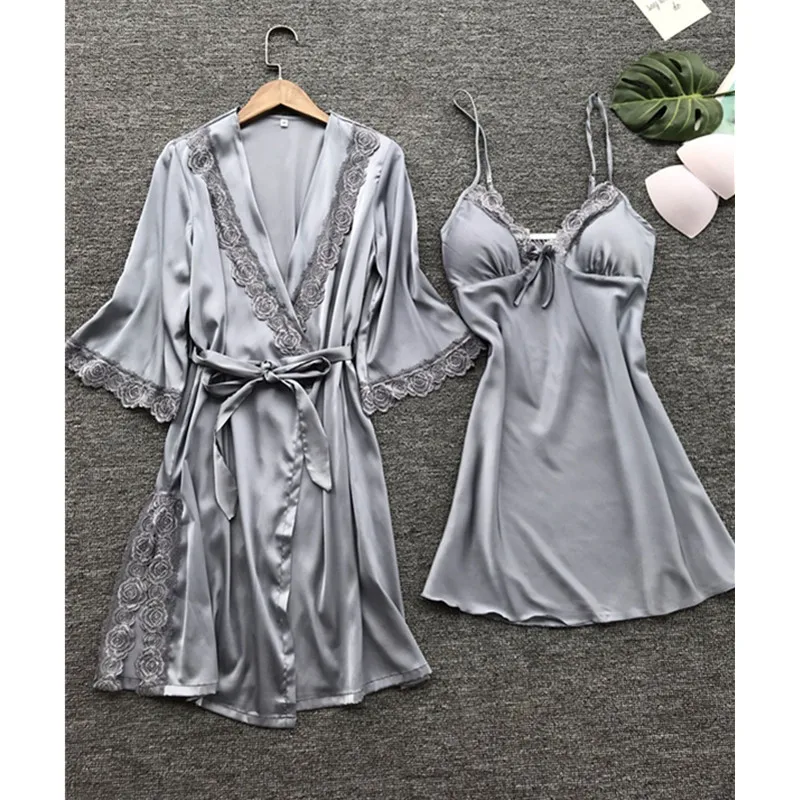 Для женщин кружева сатиновая мягкая Пижама Халат пижамный комплект Femme сексуальный топ на бретельках Ночная Рубашка шелковая одежда для сна 2 шт. одежда для сна с груди колодки 2020