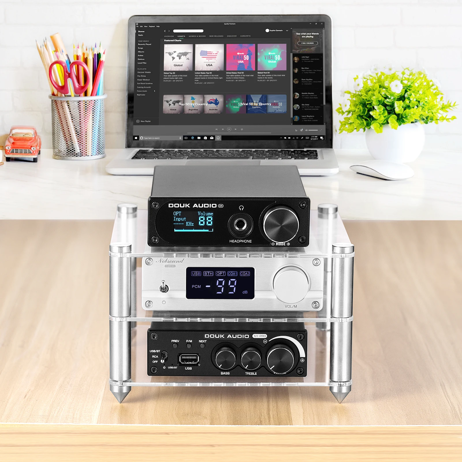 Каждая акриловая доска с дополнительными отверстиями для рассеивания тепла, убедитесь, что ваши прекрасные аудиоустройства могут получить много циркулирующего воздуха, который будет держать их от перегрева во время использования. И вы можете купить 2 шт. и сложить вертикально, чтобы получить несколько слоев и разместить больше аудиоустройств в порядке.