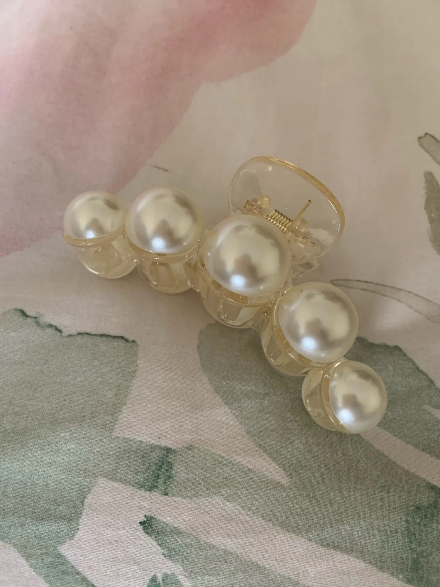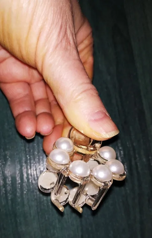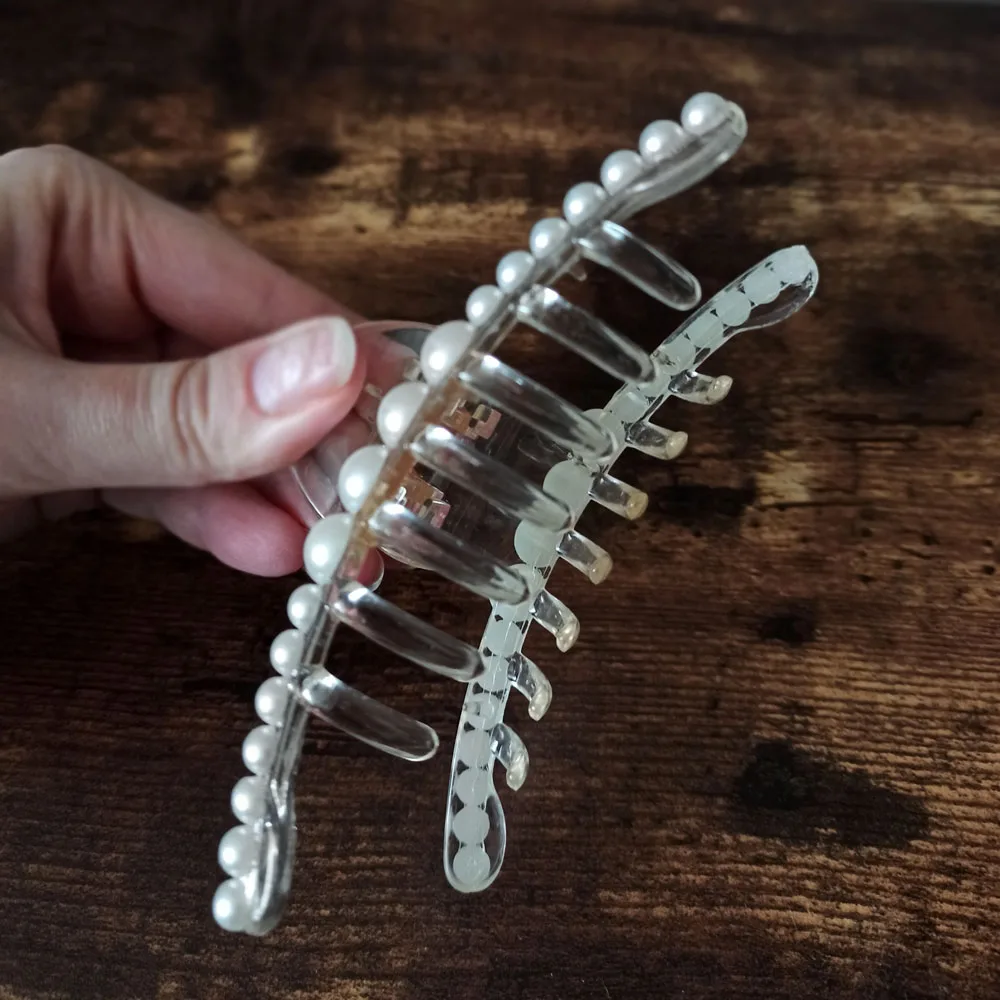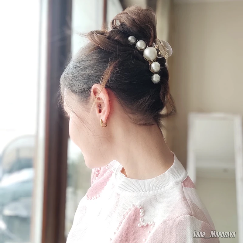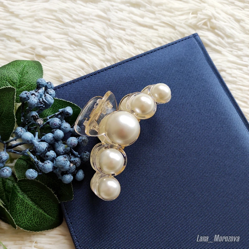 Выполнена из акрила, механизм металлический. Акриловые жемчужины приклеены, следов клея не видно. Фиксирует хорошо даже густые и длинные волосы, при носке может немного съезжать есть мотать головой, но в принципе, не критично. Мне нравятся такие заколки именно из акрила, потому что они менее травмируют и тянут волосы. В течении для не устаешь от них.