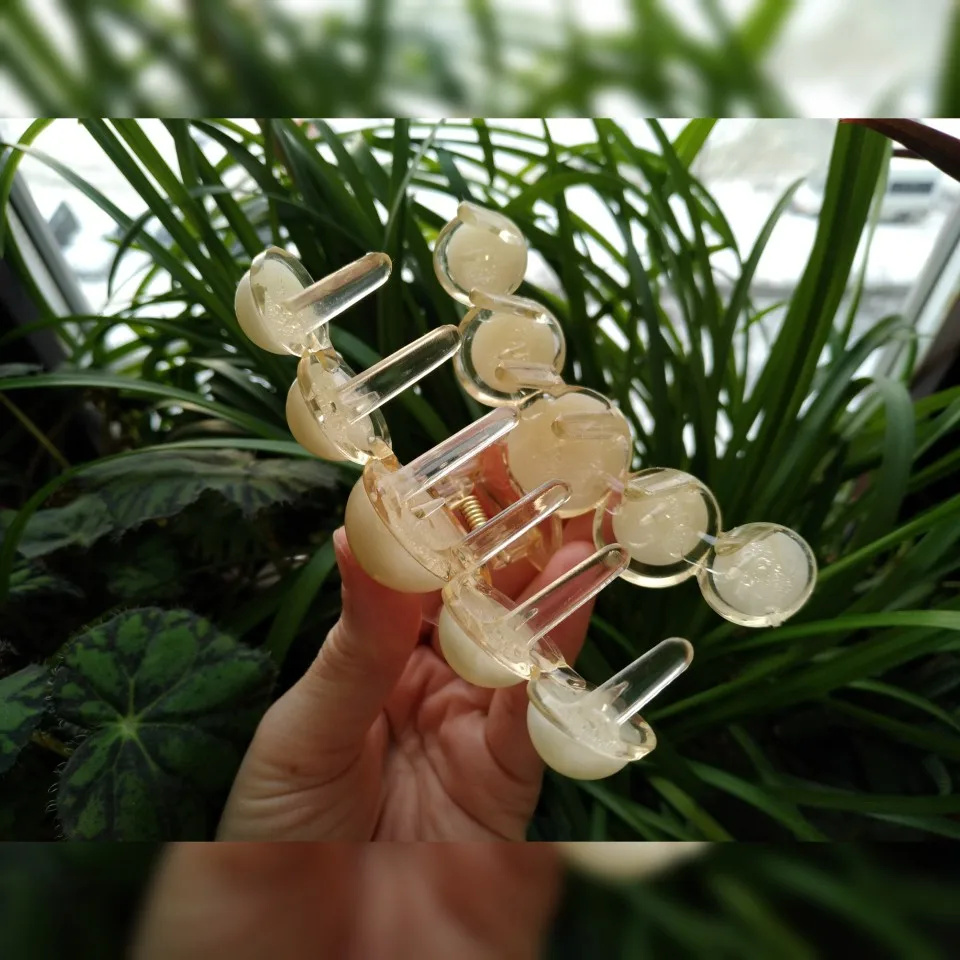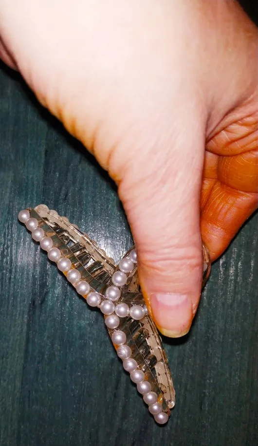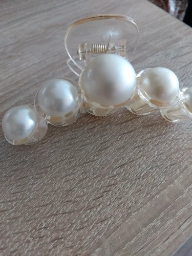 Доставка была не длительная, упаковка в полном порядке. Крабик приехал без негативных нюансов, все жемчужины на местах. Заколка выполнена из крепкого пластика. Соединена металлическим шурупом и упругой пружиной. Зубья крупные - отлично удерживают волосы. Декор красивый! В моём случае он очень крупный, напоминает жемчуг молочного цвета с красивым перламутровым отливом. Декор приклеен аккуратно, следов клея нет. Заколка очень удобная. Смотрится на волосах здорово! Выполнено качественно.