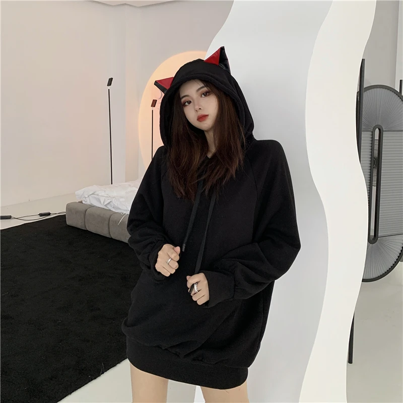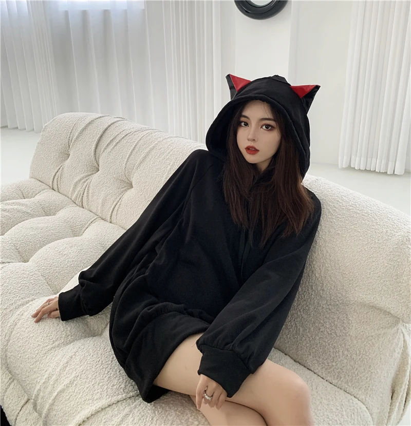Женские худи в стиле Харадзюку, панк, готика, черный дьявольский рог, Свободные повседневные свитшоты с длинным рукавом, женские осенне-зимние топы, Новинка