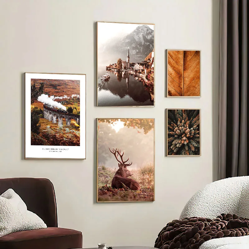 Скандинавский пейзаж, настенный художественный плакат с листьями, п...