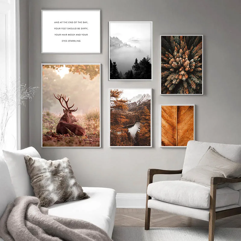 Скандинавский туман лес олень животное холст настенная живопись гор...