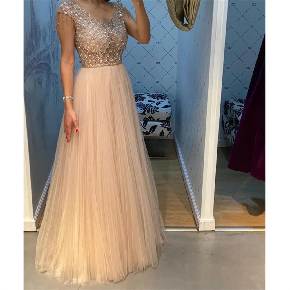 YUNUO 2021 элегантное Тюлевое платье с V-образным вырезом для выпускного вечера ТРАПЕЦИЕВИДНОЕ ПЛАТЬЕ С Рукавом-крылышком вечернее платье с бисером Длинные вечерние платья