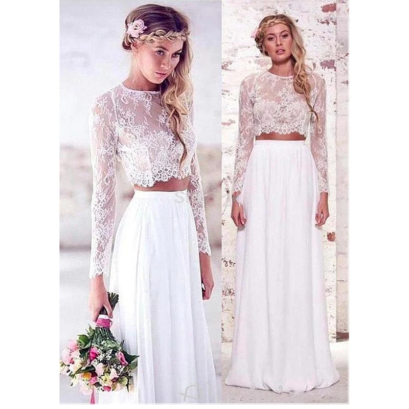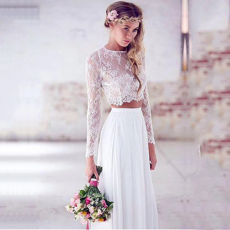 Шифоновое свадебное платье из двух частей 2021 с длинными рукавами, белое кружевное пляжное платье невесты богемные Свадебные платья размера плюс