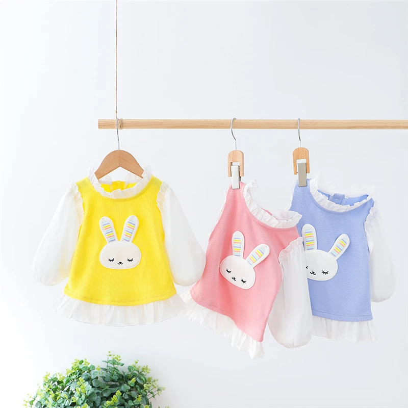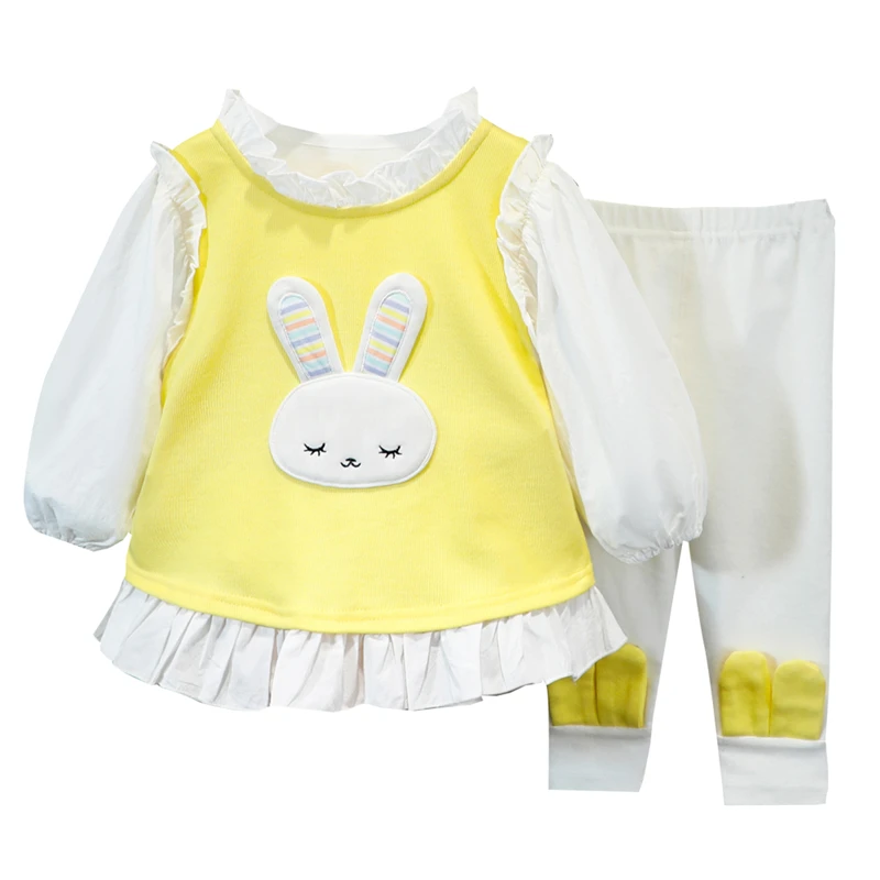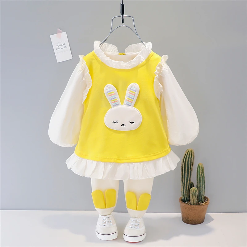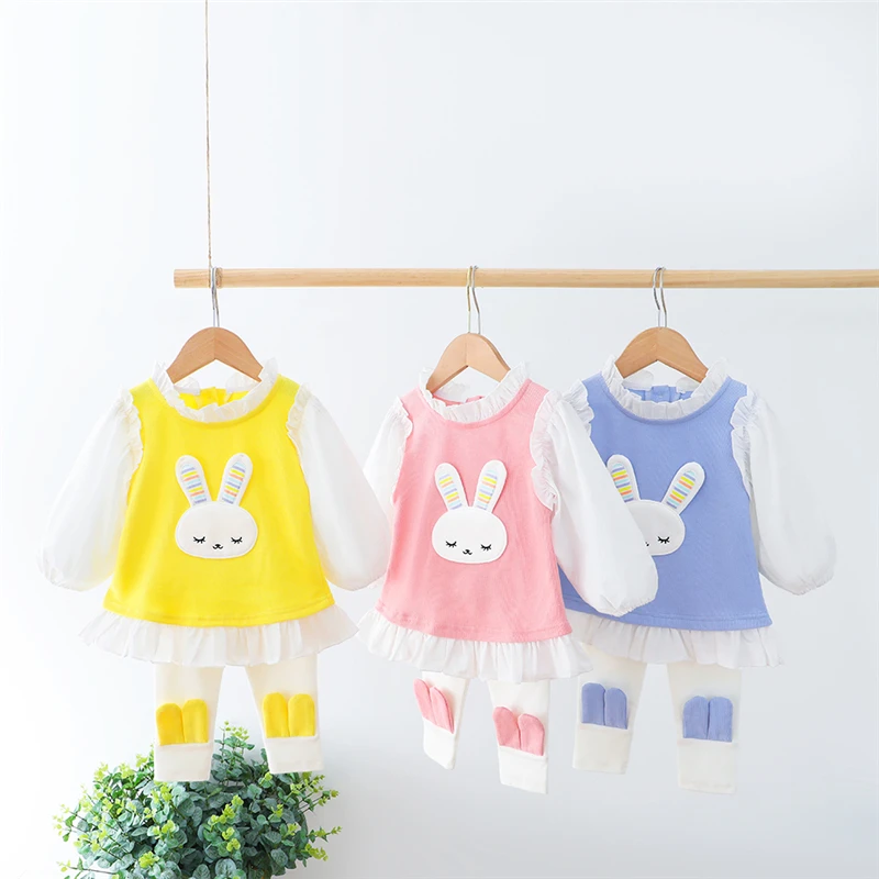 Комплекты одежды для девочек, весенне-осенняя Кружевная футболка с кроличьими ушками и штаны, детская одежда, мультяшный повседневный наряд для малышей