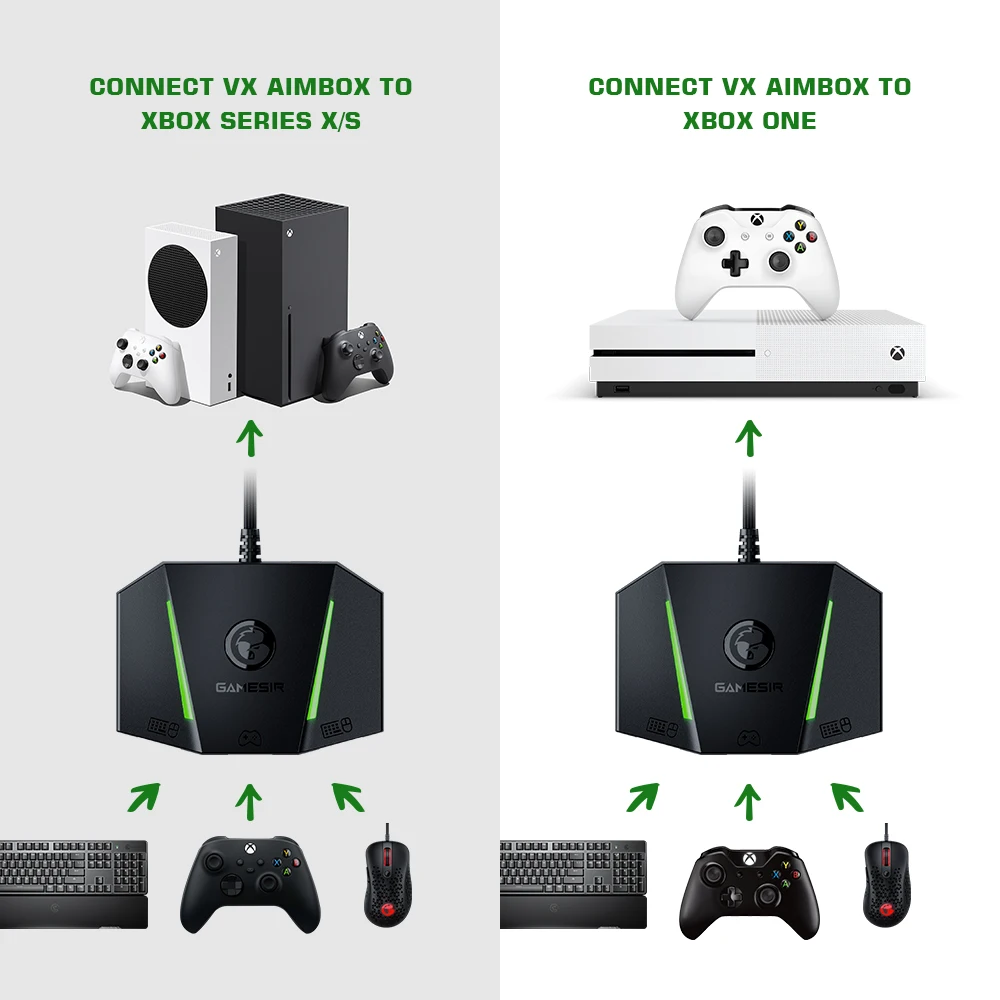 GameSir VX AimBox позволяет игрокам выбирать наиболее подходящее Входное устройство-будь то с ПК или консоли, или играть в игры на столе или диване в гостиной. С помощью VX AimBox вы можете использовать игровое оборудование для ПК, чтобы играть в игры на Xbox серии X/S, Xbox One, PlayStation 4 (PS4) и Nintendo Switch.