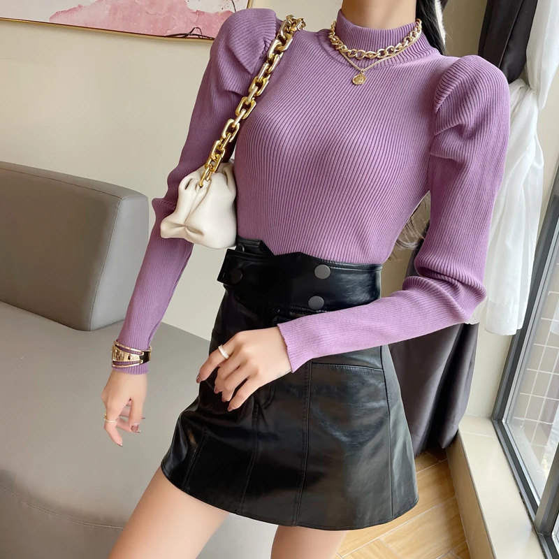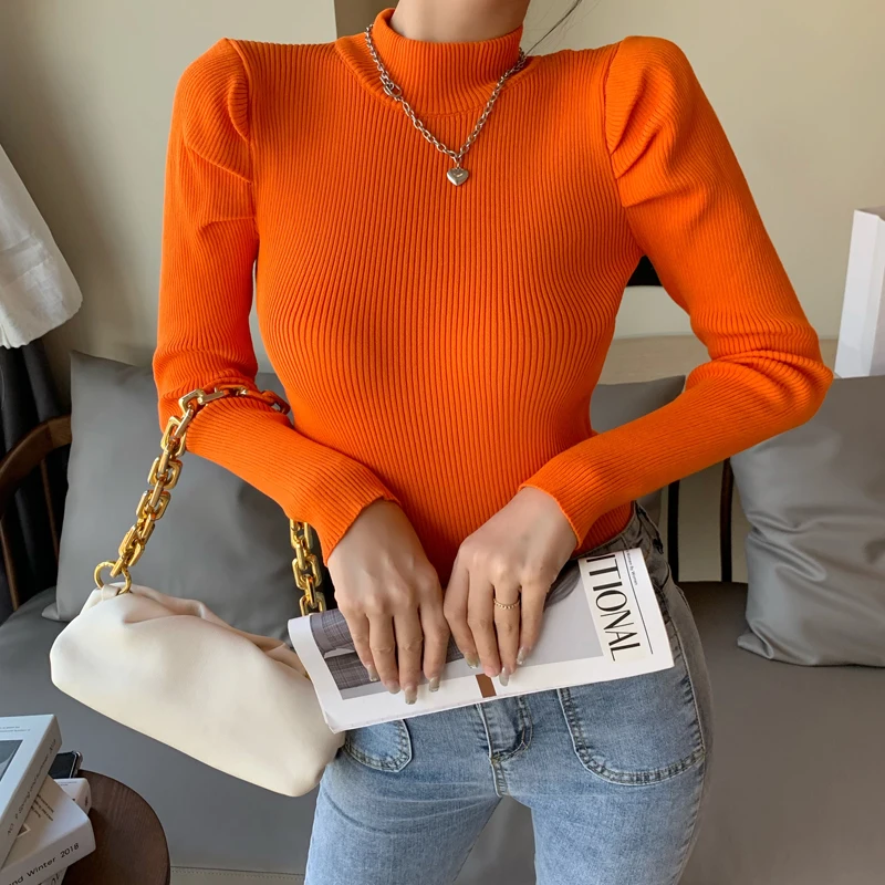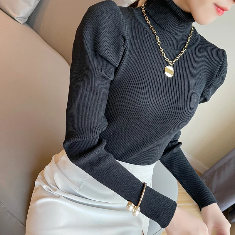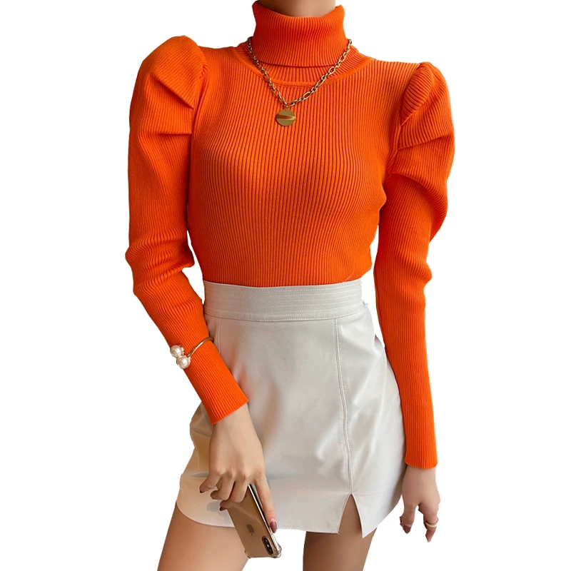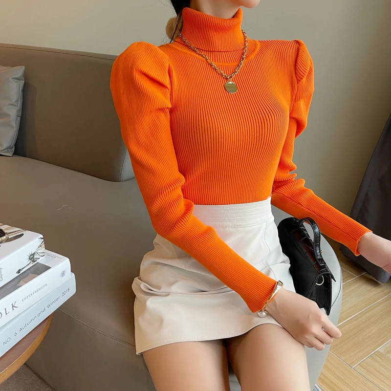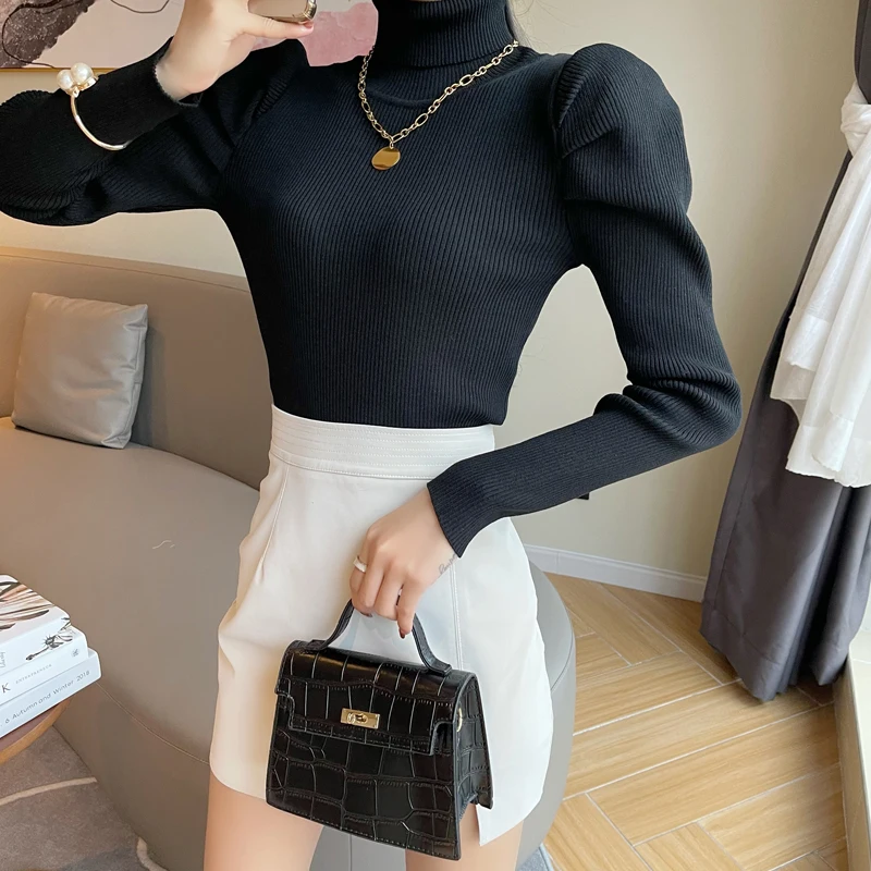 Женский вязаный свитер с высоким воротником, однотонный эластичный уличный свитер с длинным рукавом, винтажный буф, зима 2019
