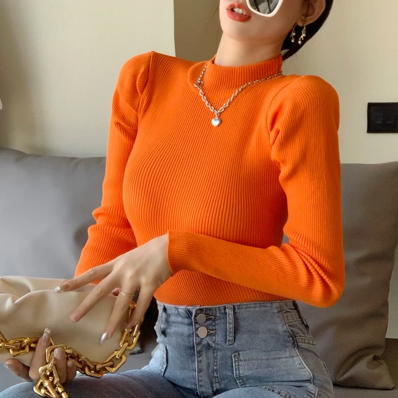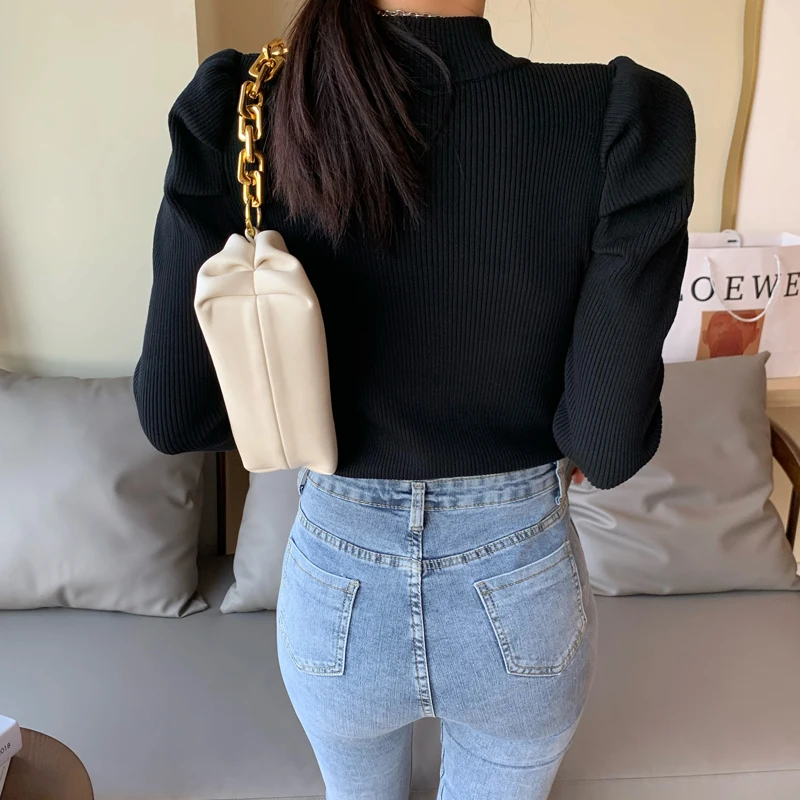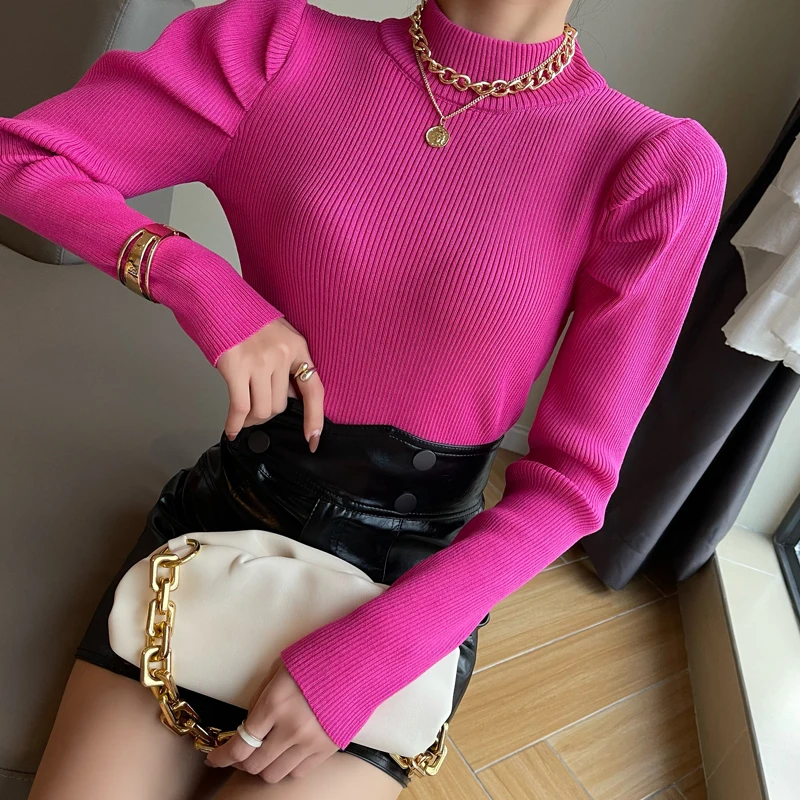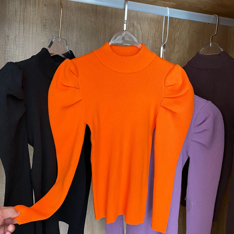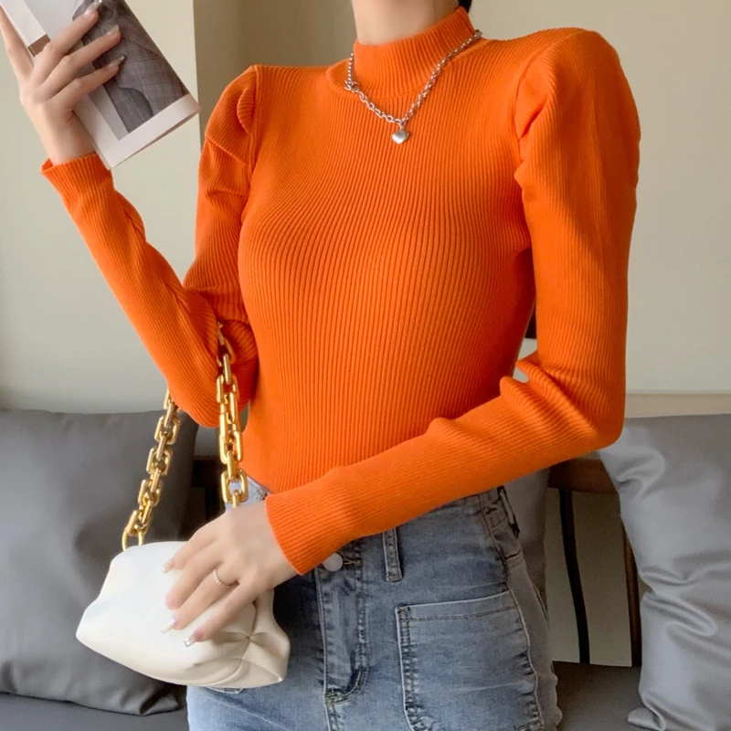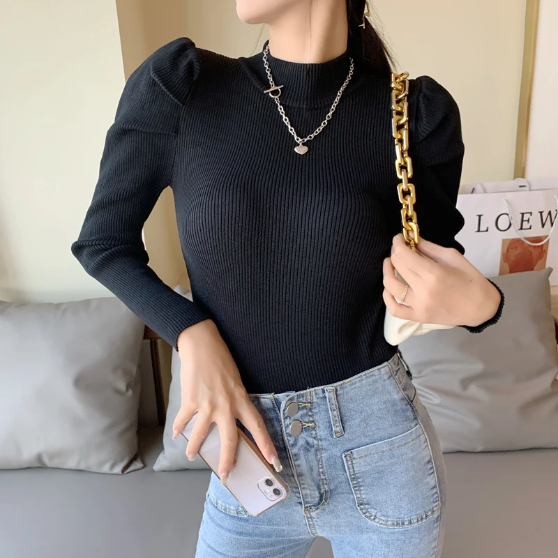 Женский вязаный свитер с высоким воротником, однотонный эластичный уличный свитер с длинным рукавом, винтажный буф, зима 2019