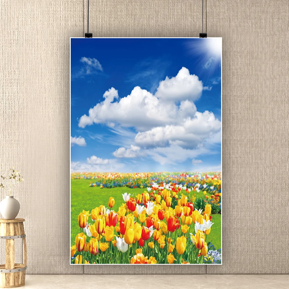 Laeacco голубое небо облака весенние цветы трава фоны фотографии природный пейзаж Новорожденный ребенок Портрет фон фотостудия