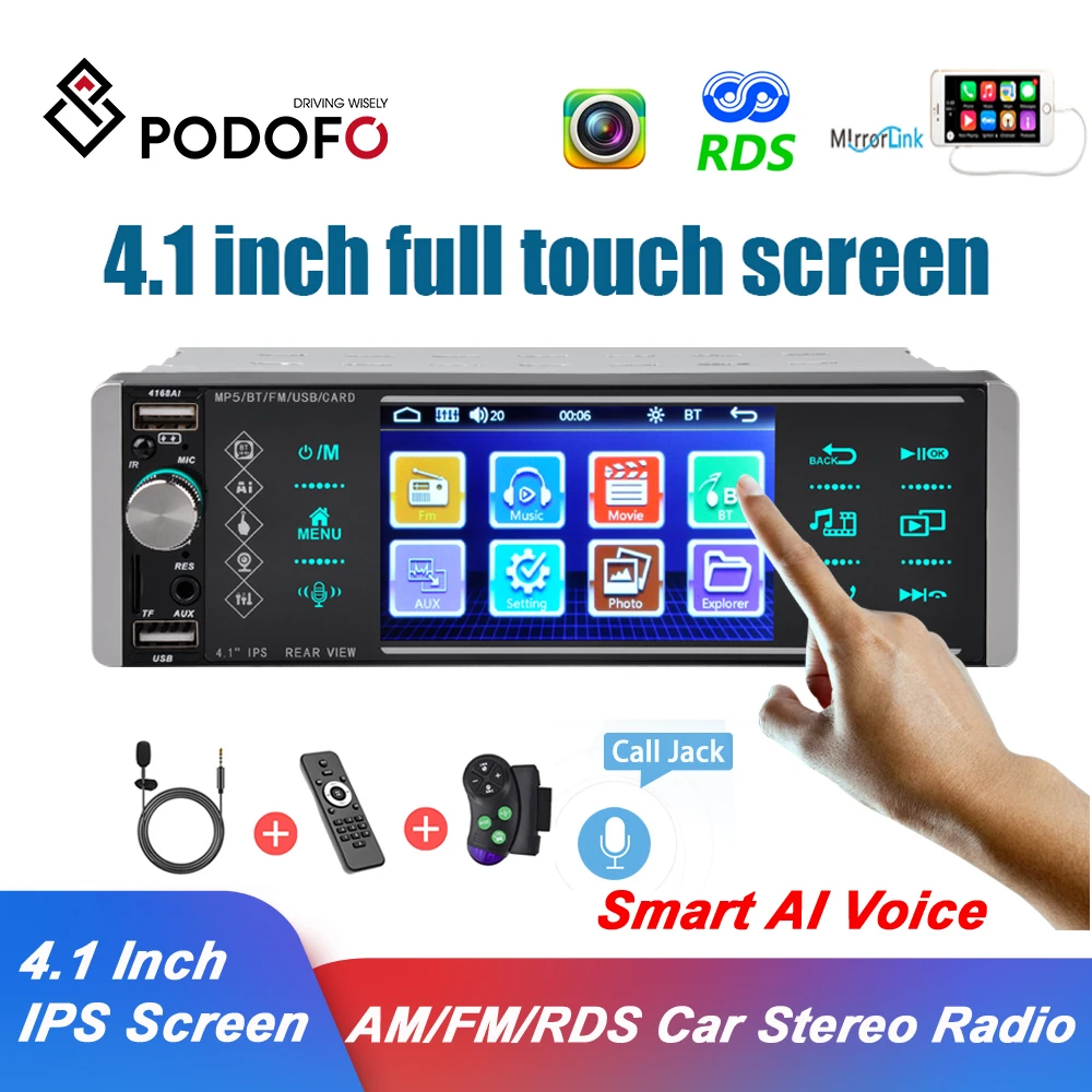 Podofo Смарт AI счета-фактуры, 1 Din Автомобильная Стереосистема радио Зеркало Ссылка RDS AM FM приемник 4-USB 4,1 дюймов IPS сенсорный Экран MP5 видео плеер