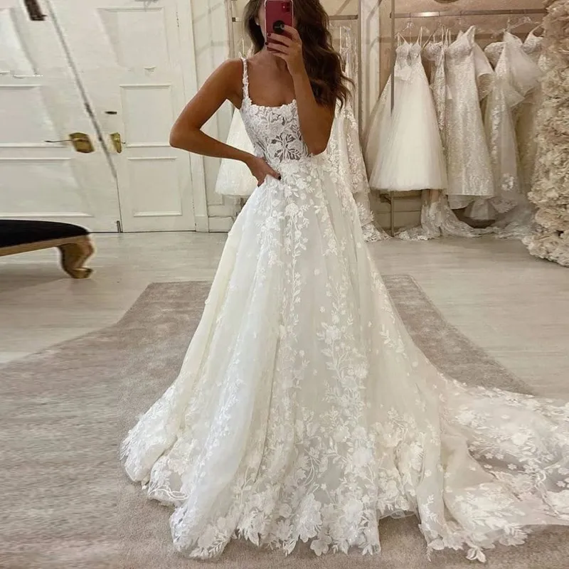 Эксклюзивное кружевное свадебное платье-трапеция 2022 на бретельках, свадебное платье с открытой спиной, летние пляжные элегантные фатиновые свадебные платья