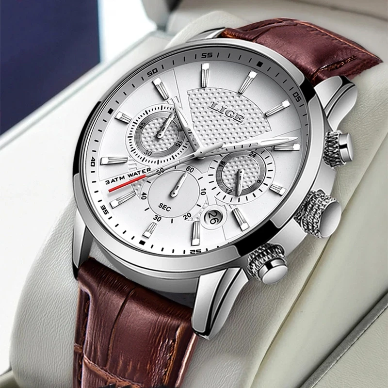Часы наручные LIGE Мужские кварцевые с хронографом, брендовые водонепроницаемые спортивные автоматические, с кожаным ремешком, с датой, 2020