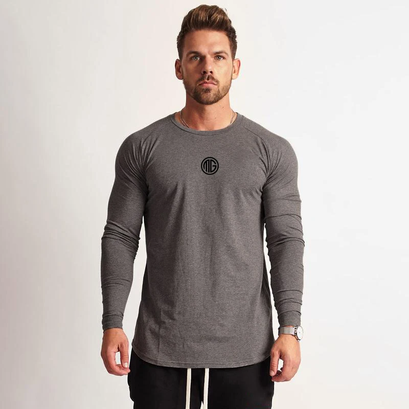Весенняя хлопковая футболка с длинным рукавом, мужская спортивная футболка для фитнеса, бодибилдинга, облегающая футболка, Мужская модная футболка, брендовая спортивная одежда