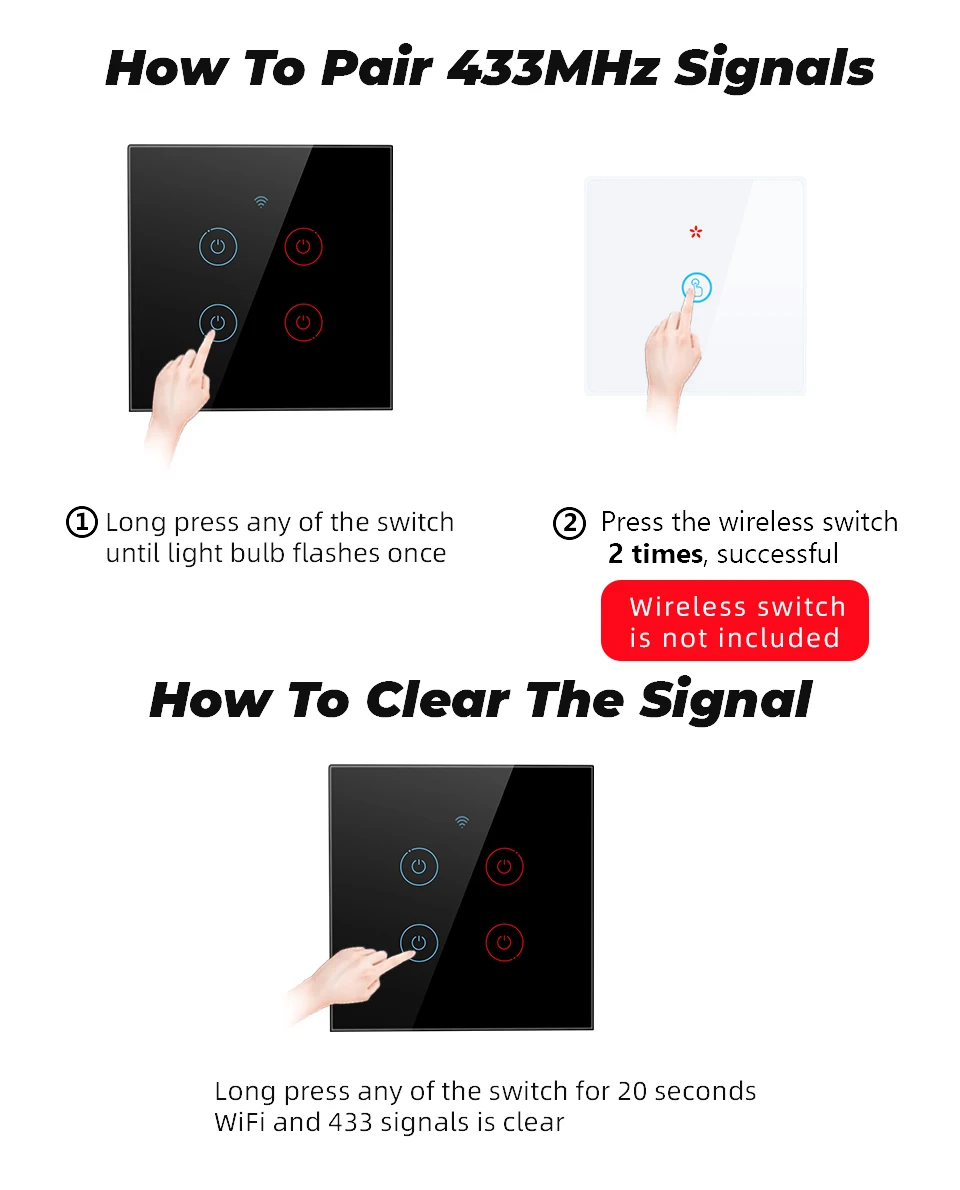 Шаг 1: Найдите «Smart Life или Tuya Smart» в APP store, Google Play или отсканируйте QR-код в руководстве пользователя, чтобы загрузить и установить его.Шаг 2: удерживайте и удерживайте любую кнопку на переключателе, пока светильник катор не мигнет. Вы также услышите звук «Ди».Шаг 3: Откройте «Smart Life или Tuya Smart App», обнаружите и добавьте устройство в приложение, а затем Завершите настройку в соответствии с руководством.Метод сброса: Нажмите и удерживайте сенсорную кнопку около 10 секунд, пока красный индикатор не начнет мигать, и переключатель издаст звук «Ди» 2 раза.Примечание: Если вы хотите использовать оба метода управления, Пожалуйста, подключите RF заранее. В противном случае это повлияет на подключение к Wi-Fi.