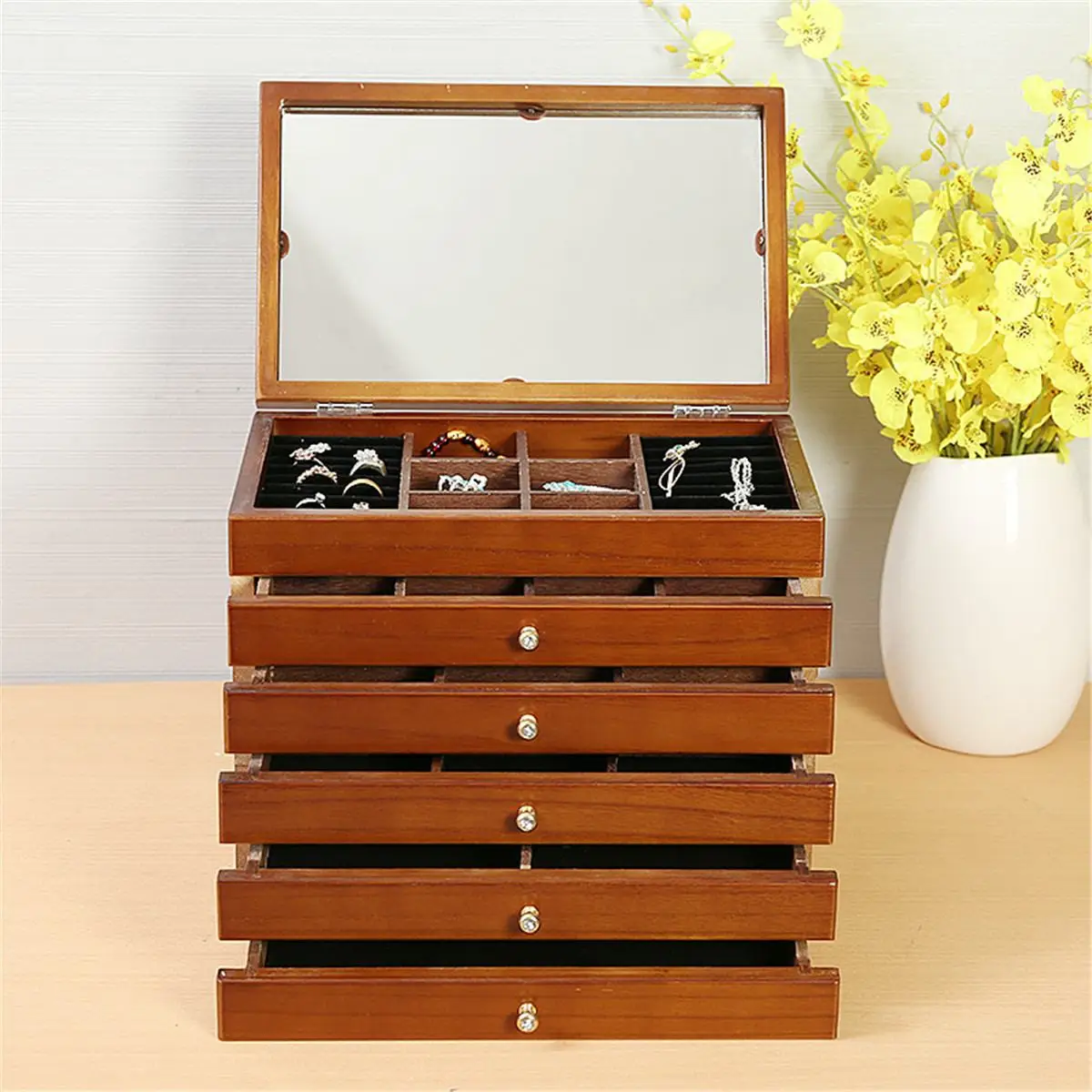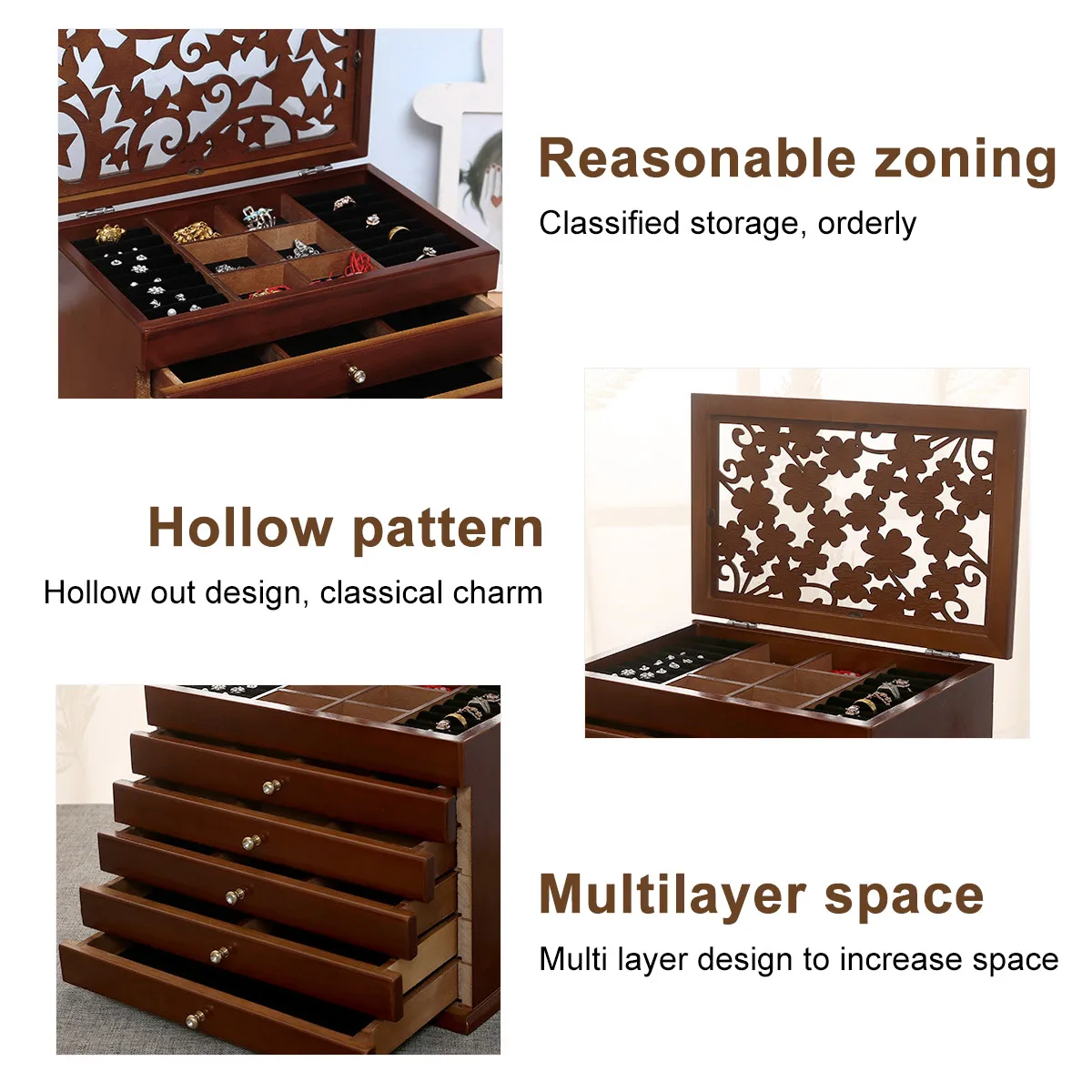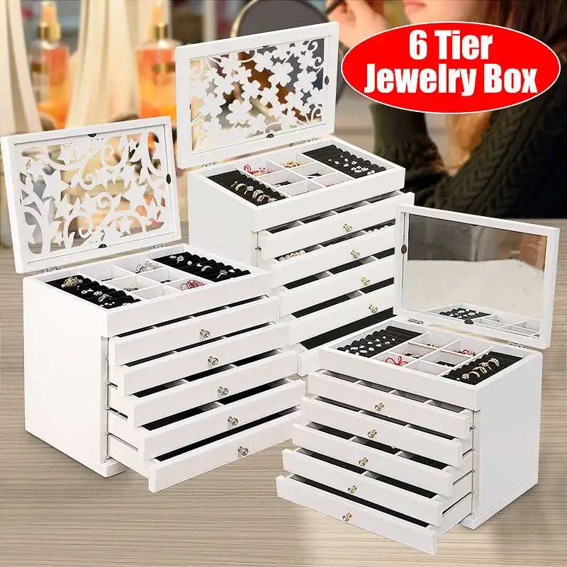 Шкатулка для ювелирных изделий 6 ярусный деревянный, многофункциональная винтажная витрина с полыми и зеркальными элементами для хранения колец, подарочная коробка