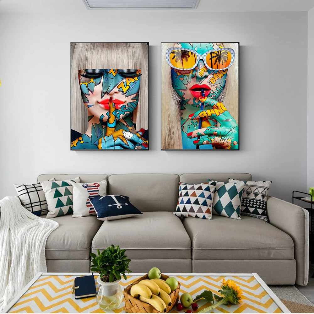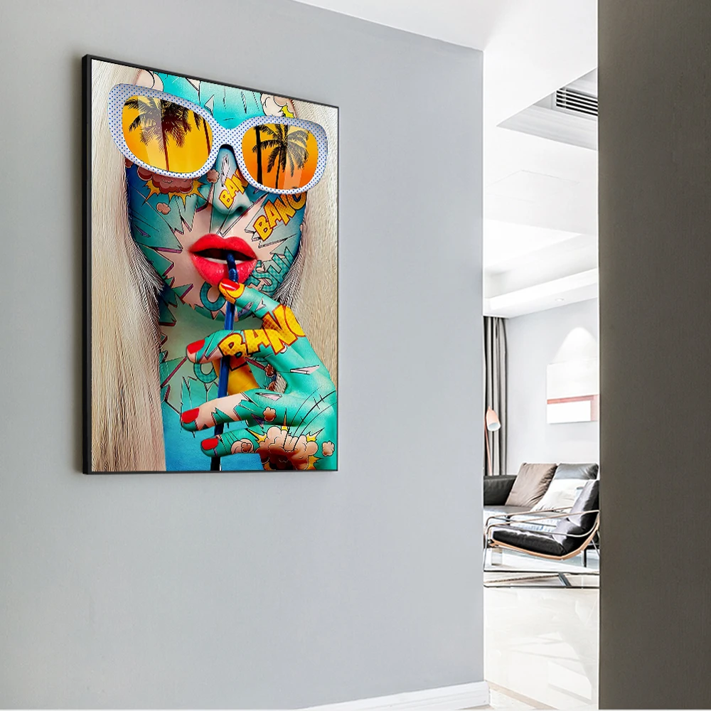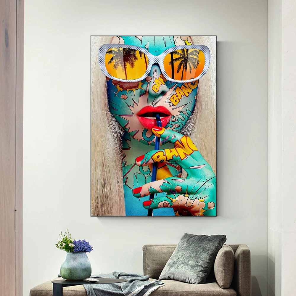 Граффити красные губы Тиш очки девушка питьевой искусство холст печать живопись Современная Настенная картина женщина гостиная домашний декор плакат