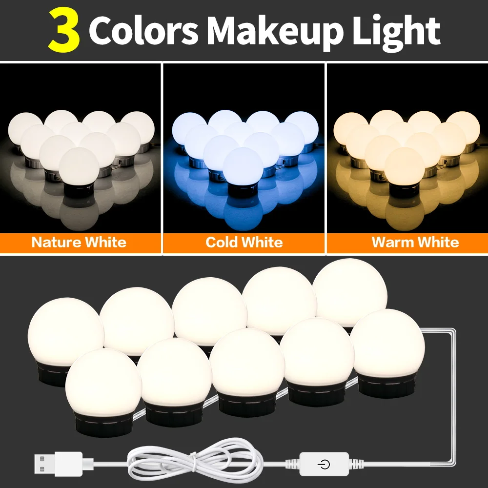 Светодиодная лампа для туалетного зеркала, 3 цвета, 12 В, USB, с регулируемой яркостью, светодиодсветодиодный лампа для макияжа, 2, 6, 10, 14 лампочек, украшение для стола для макияжа