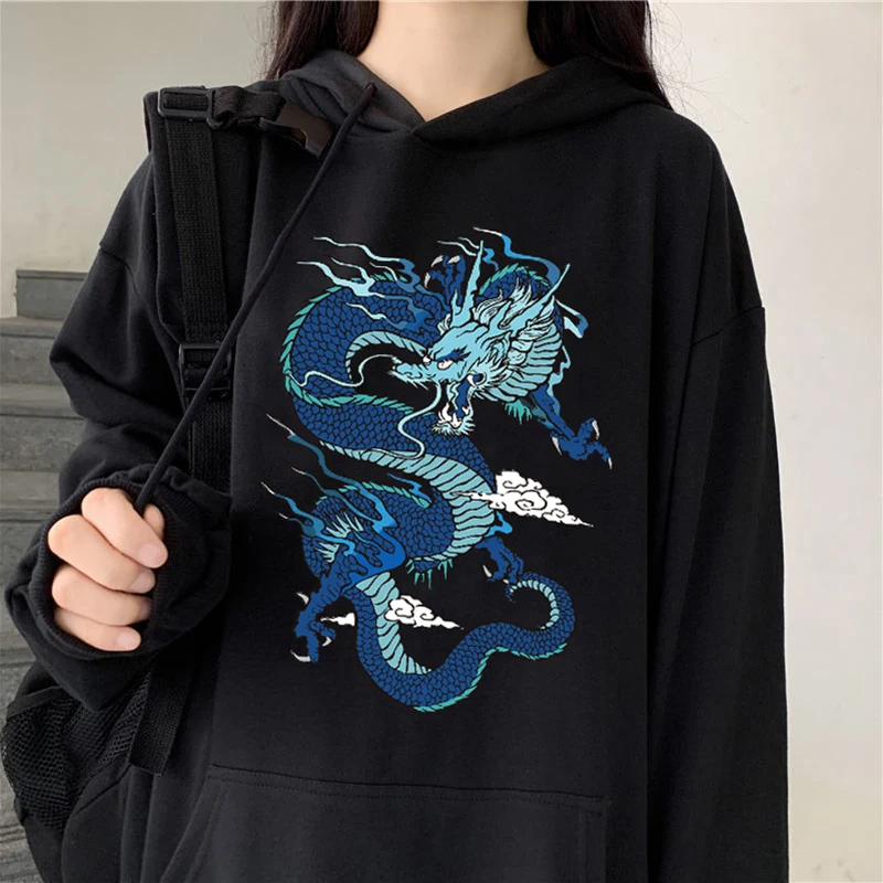 Черная Толстовка с принтом дракона и огня, одежда для женщин, молодежная одежда в стиле Харадзюку, готический Свободный теплый свитшот, винтажный свитшот для подростков