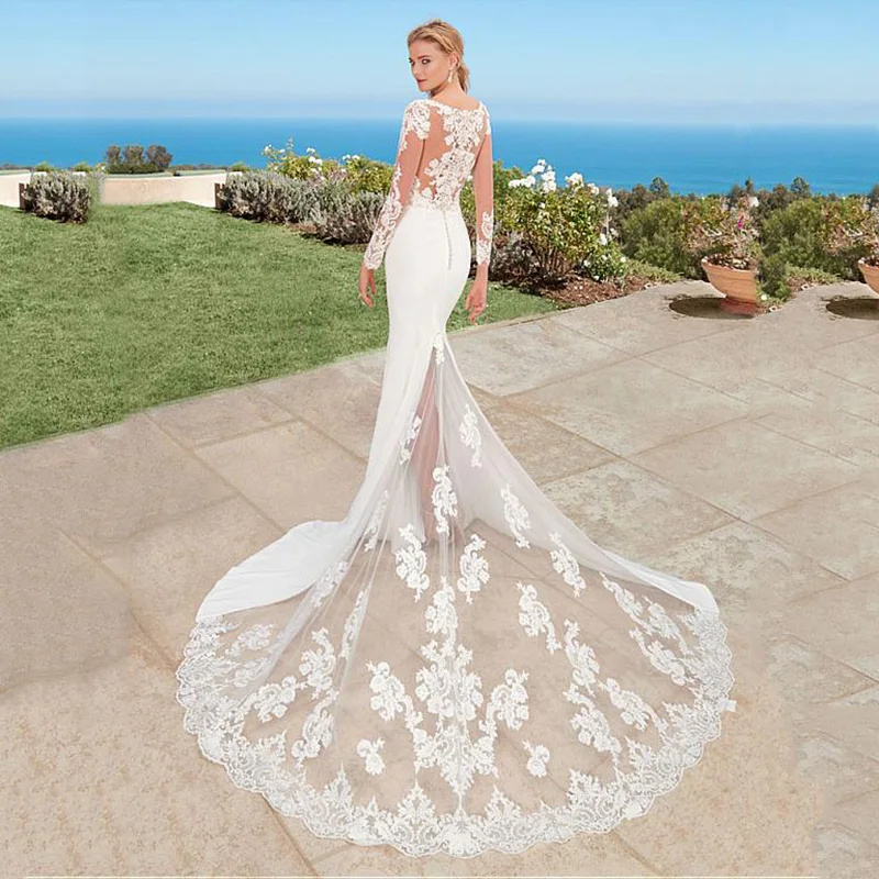 Женское свадебное платье с юбкой-годе, кружевное платье с длинными рукавами, аппликацией и круглым вырезом, с пуговицами сзади и шлейфом, 2021