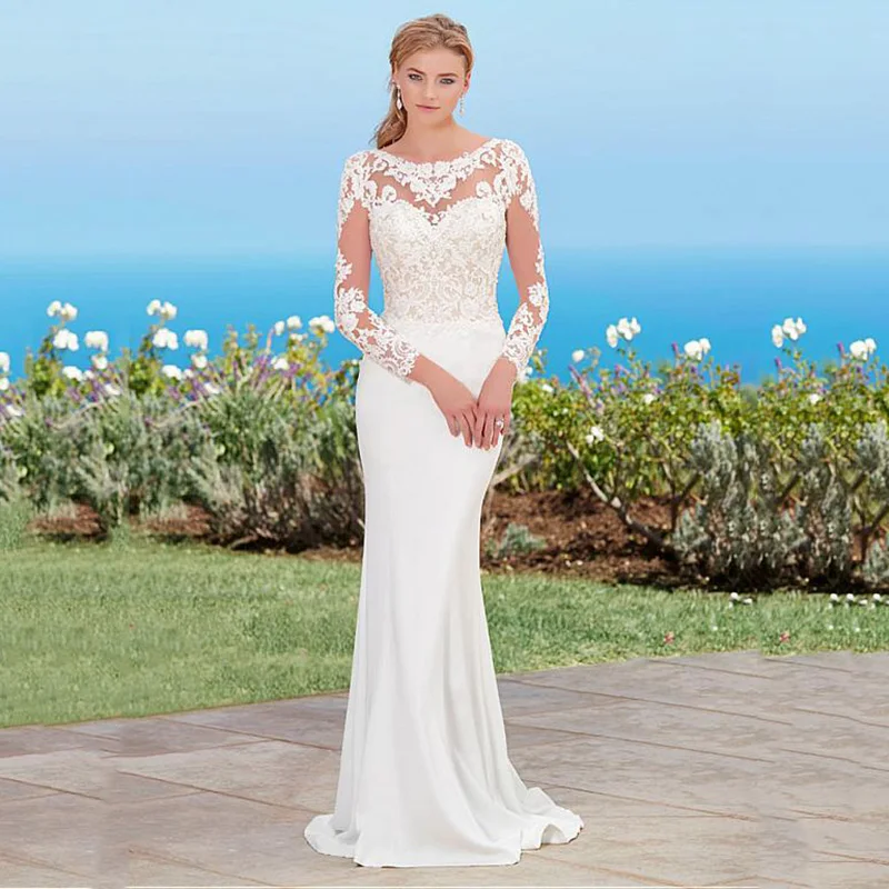 Русалка Бохо свадебное платье с длинными рукавами 2021 Аппликации Кружева Свадебное платье Назад Кнопка Глубокий круглый вырез свадебные платья со шлейфом