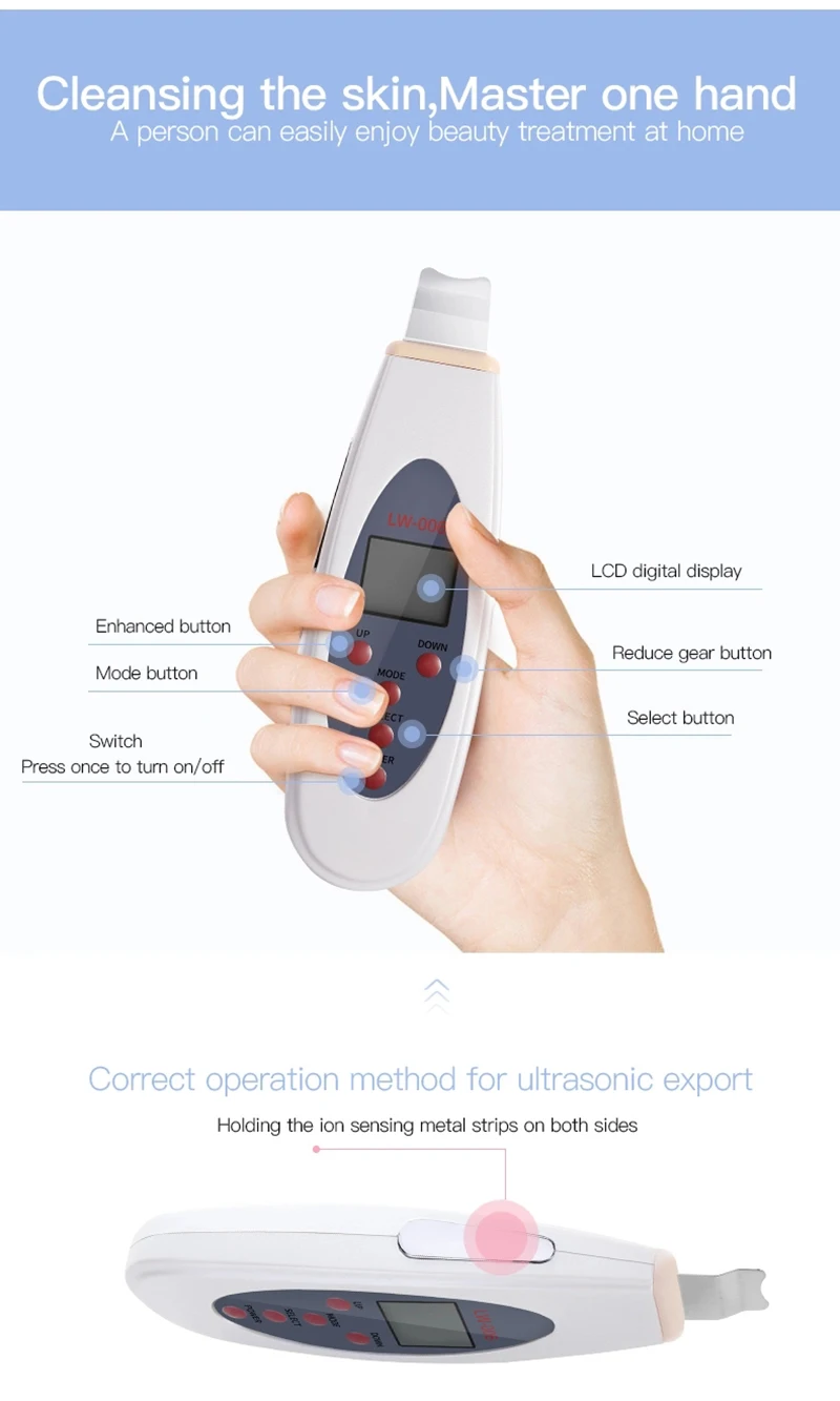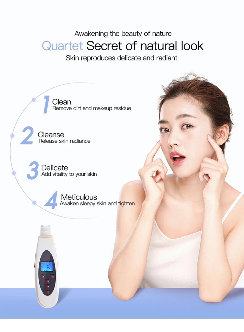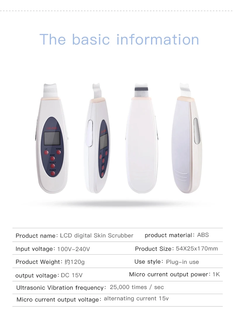 Название продукта: жидкокристаллический цифровой скруббер для кожи Материал: АБС-пластик Вход напряжение: AC 110v/220V 50/60HZ Выходное напряжение: 15 В постоянного тока Мощность: 7 Вт Операционная система: ультразвуковой Выходная мощность микро тока: 1K Выходное напряжение микро тока: переменный ток 15 в Ультразвуковая частота вибрации: 25000 раз/сек Вес: 120 г Размер изделия: 54*25*170 мм Funtion: глубокое очищение, отшелушивание, подтяжка лица, омоложение кожи Применение: для коммерческого и домашнего использования