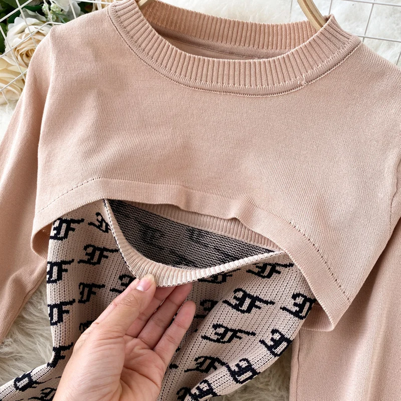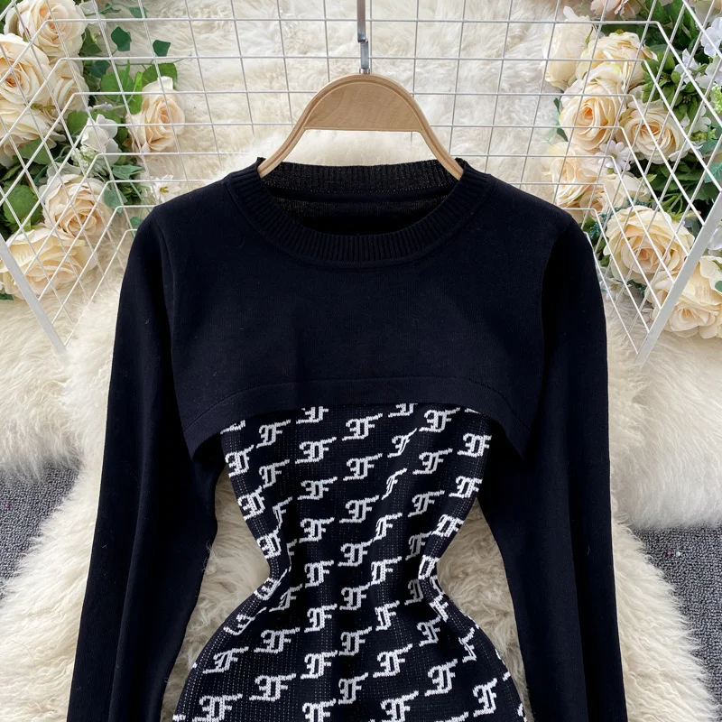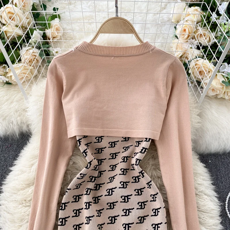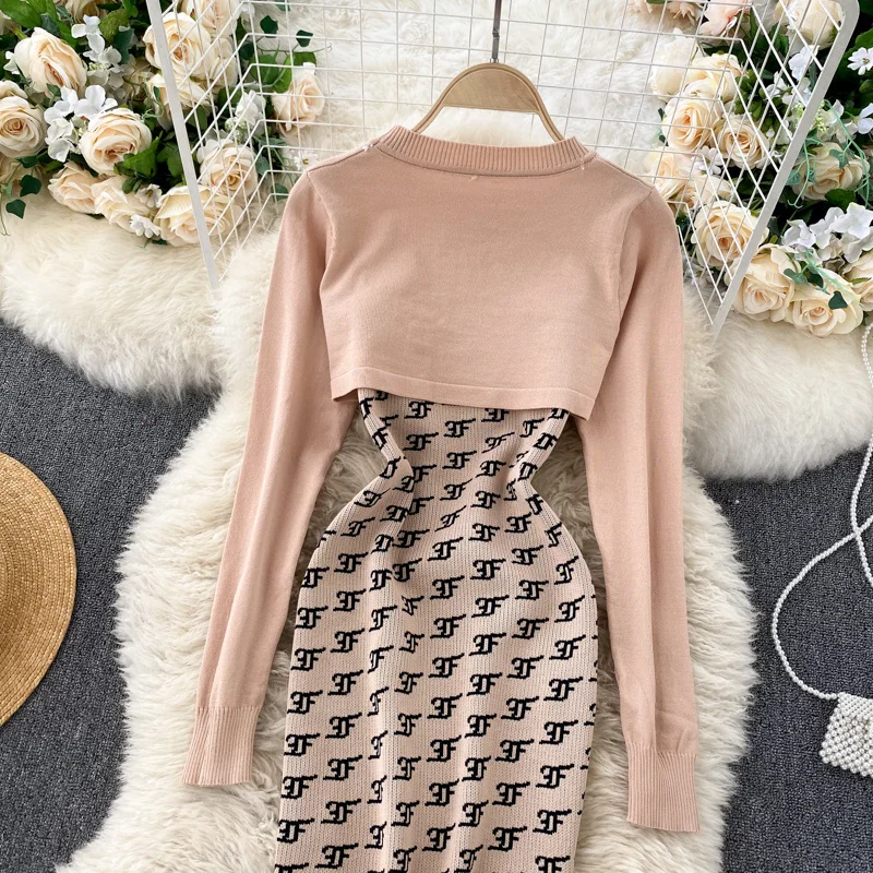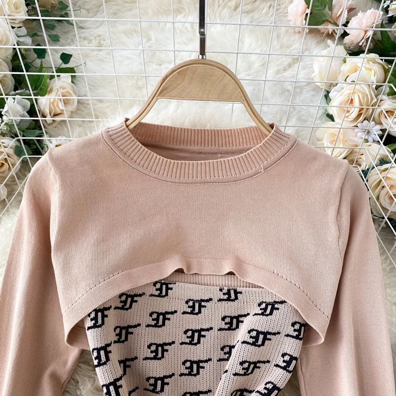 Женский вязаный комплект из 2 предметов Foamlina, в стиле ретро, с круглым вырезом и длинным рукавом, укороченный свитер на бретелях, облегающее мини-платье, костюм на осень-зиму