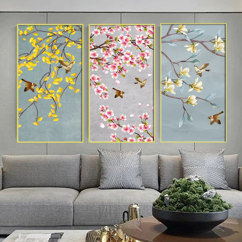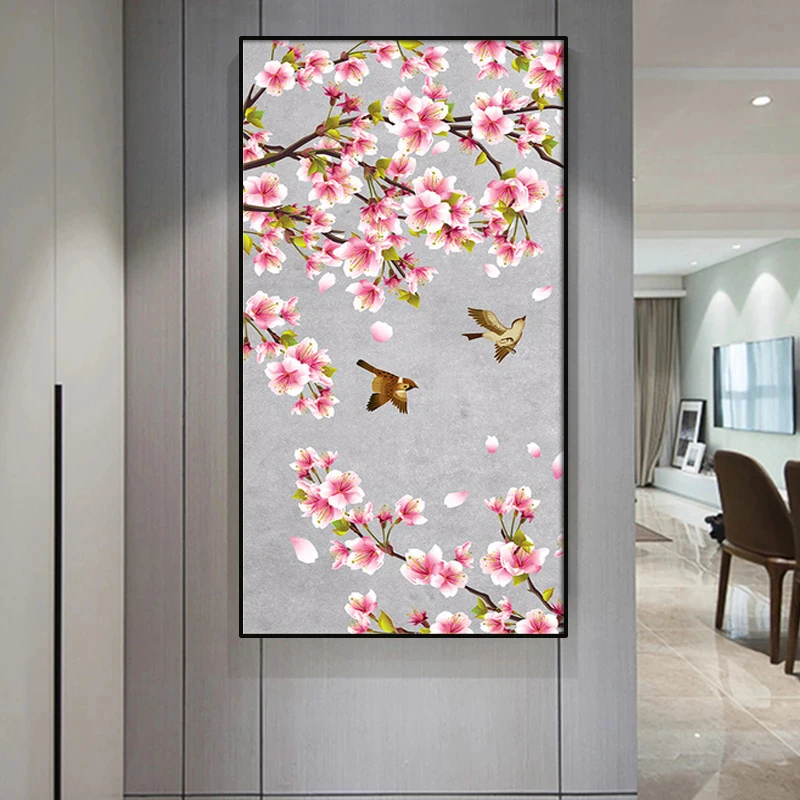 Постеры и принты в китайском стиле с птицами и цветами персика, картины на холсте для гостиной, художественные настенные картины, украшение для дома