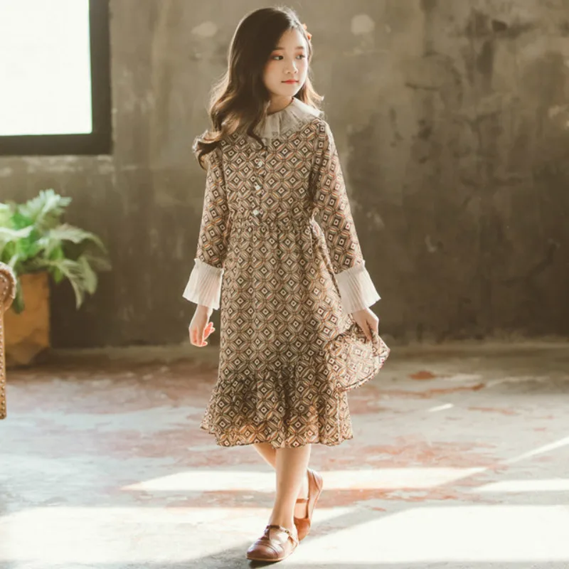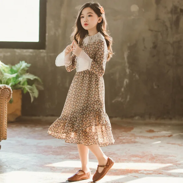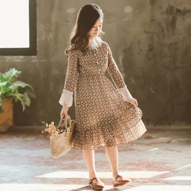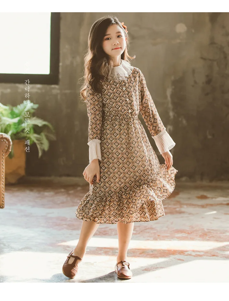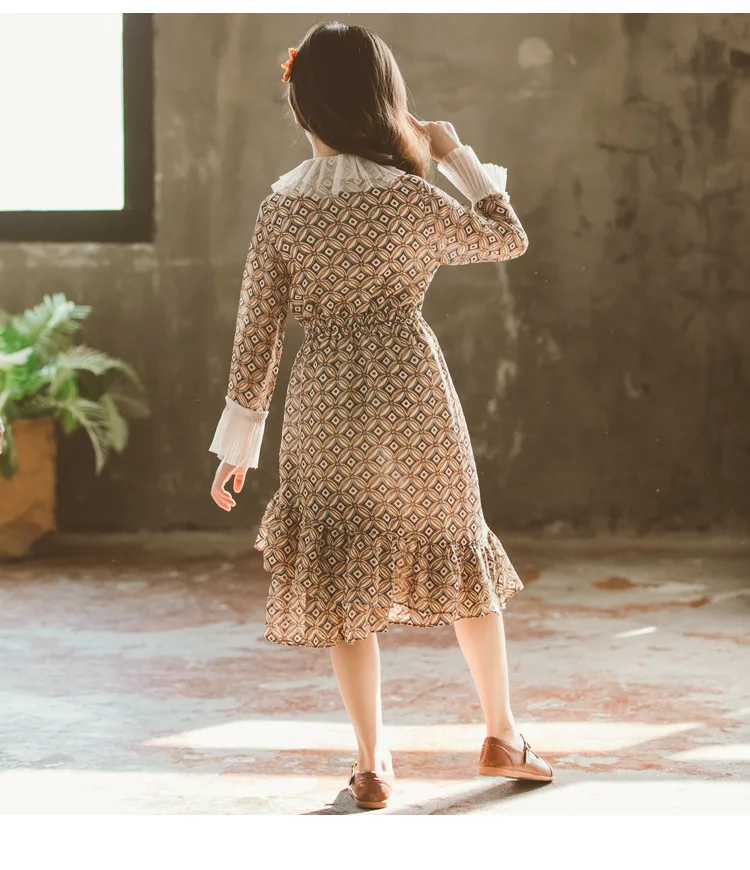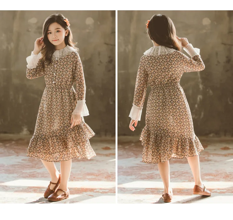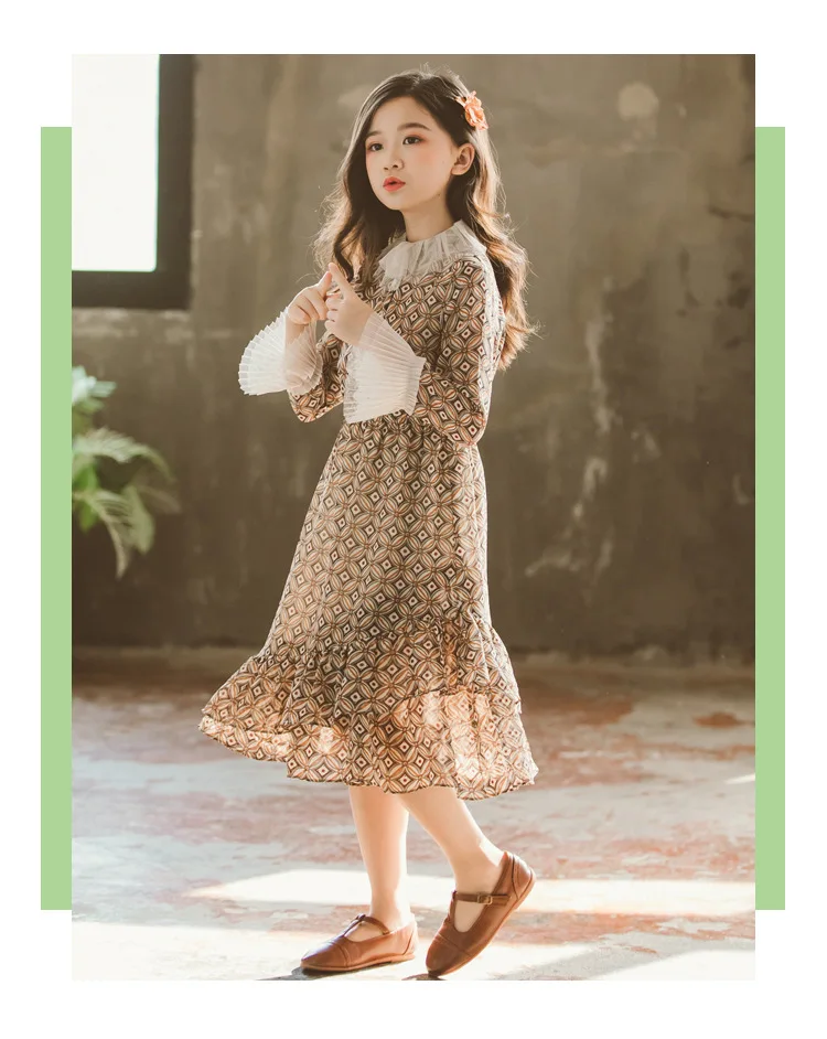 Платье для девочек-подростков, весеннее праздничное шифоновое платье с длинным рукавом, элегантный кружевной воротник с принтом, детская одежда