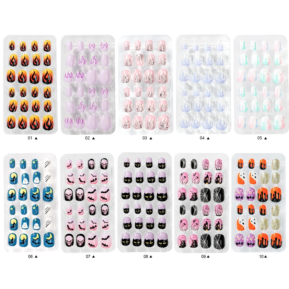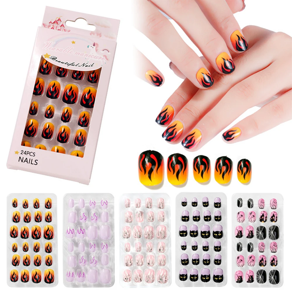 24 шт.лот Детские Типсы для искусственных ногтей на Хэллоуин, детский клей для самостоятельного дизайна ногтей для девочек, Типсы для самостоятельного маникюра и декора ногтей