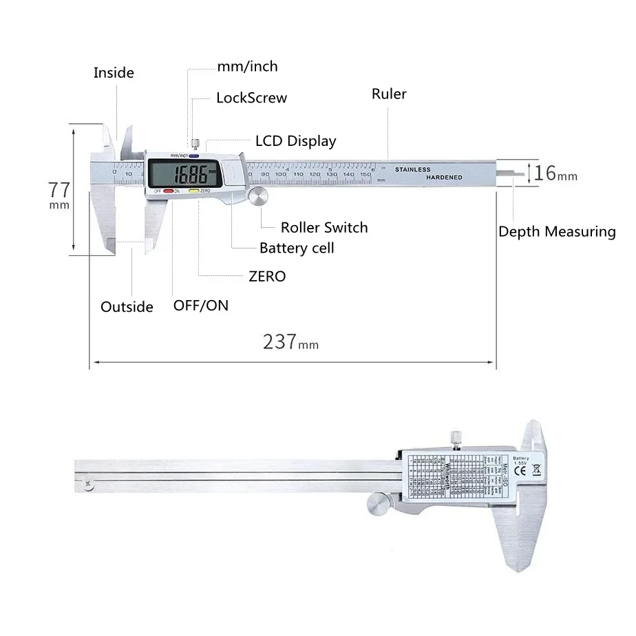 Штангенциркуль, 6 дюймов150 мм, цифровой, для столярных работ