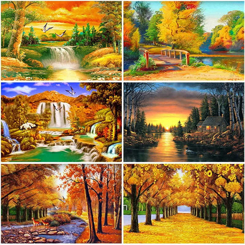 Камни в форме ромба круглый 5D водопад алмазов картина осенний пейз...