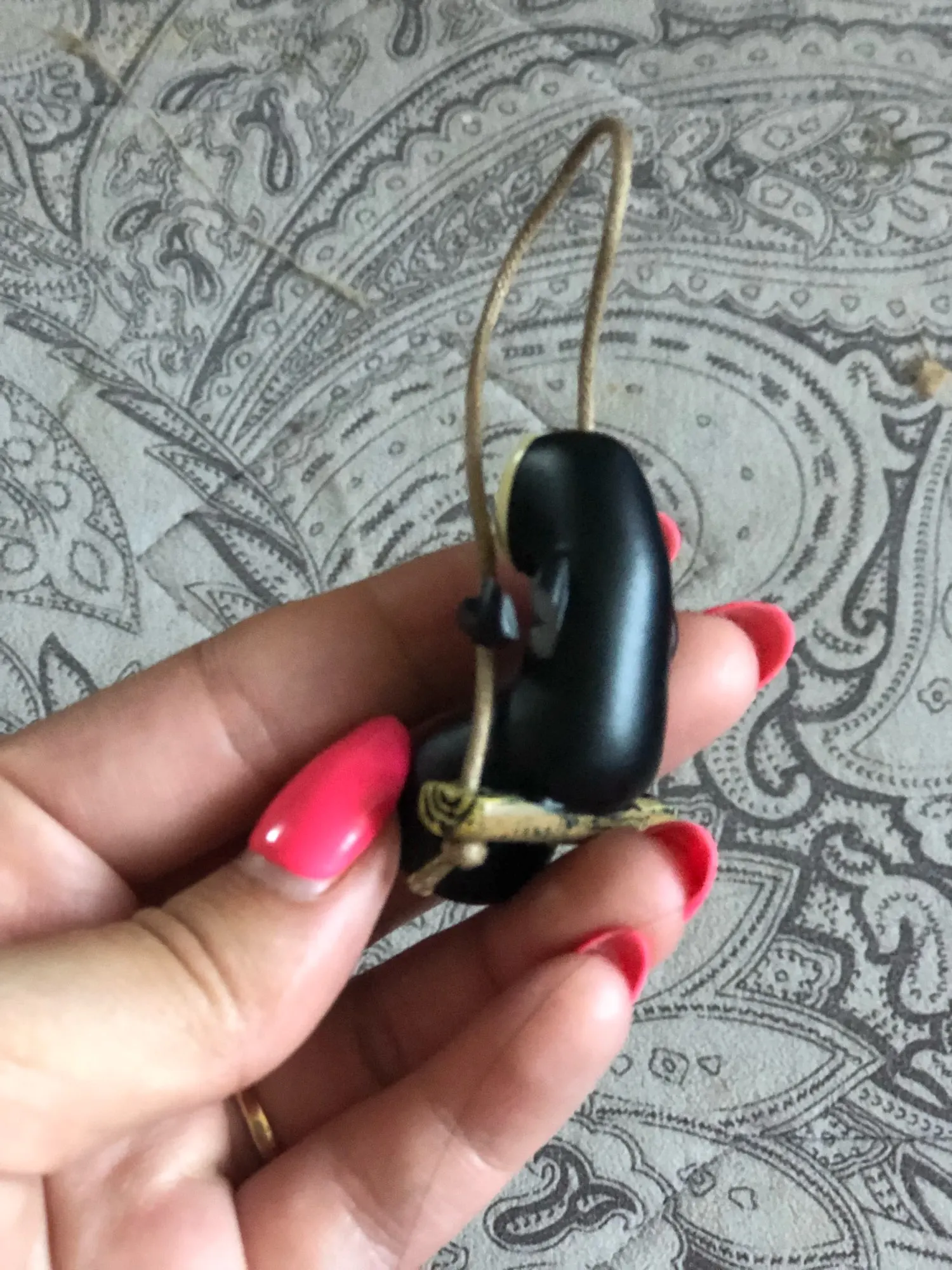Очень милая штукенция. Небольшая. Хотел повесить в машину на зеркало, но шнурок очень короткий, надо думать, как удлинять ;)