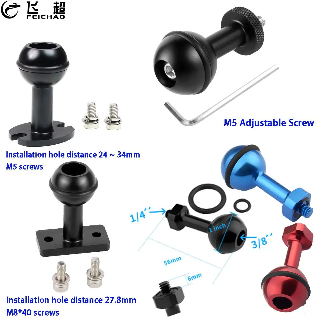 Feichao 1 дюймовый адаптер с шаровой головкой 1/4 "M5 регулируемый винт фиксированное Крепление для экшн-камеры GoPro подводный кронштейн зажим с лотком аксессуары
