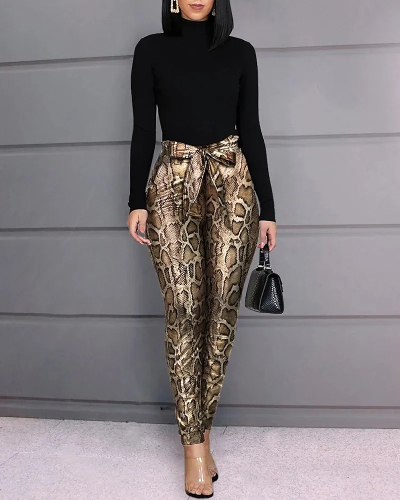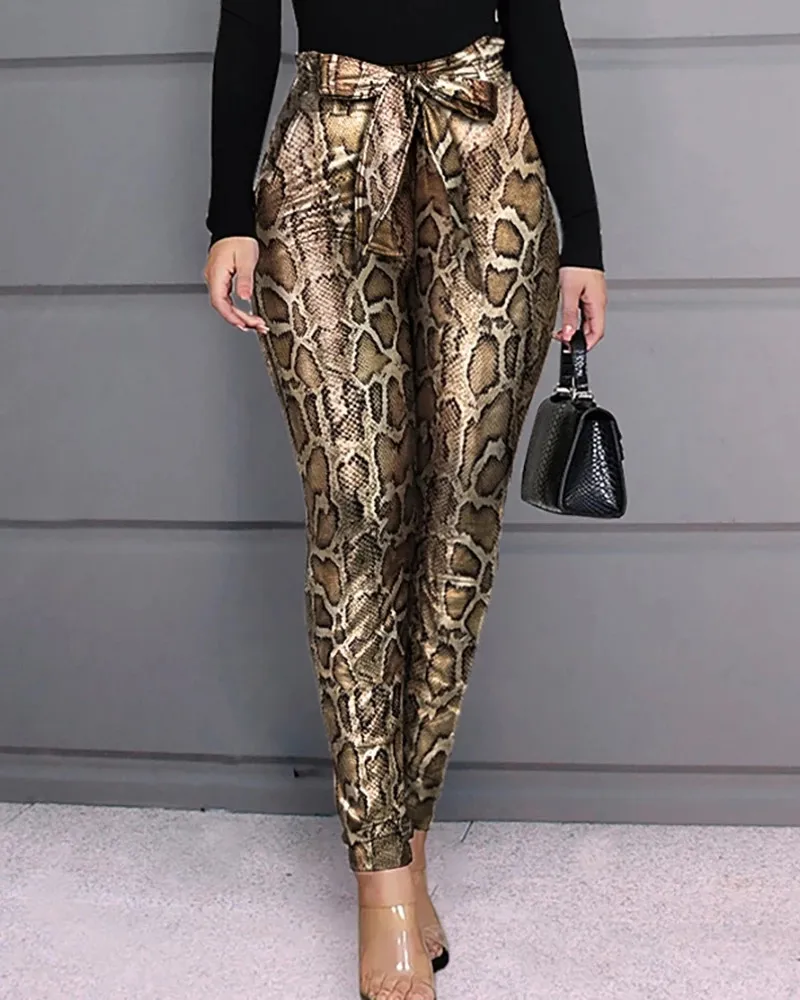 Мода змеиной кожи печати брюки для женщин с высокой талией, эластичные облегающие джинсы-карандаши голубого цвета брюки бант облегающие тонкие брюки, леггинсы