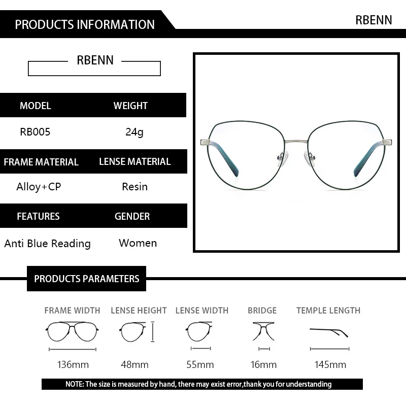 Дизайнерские очки RBENN для чтения кошачий глаз женские, в металлической оправе, с защитой от сисветильник, для женщин + 0,5, 0,75, 1,25, 1,75, 2,25, 2,75, 5,0