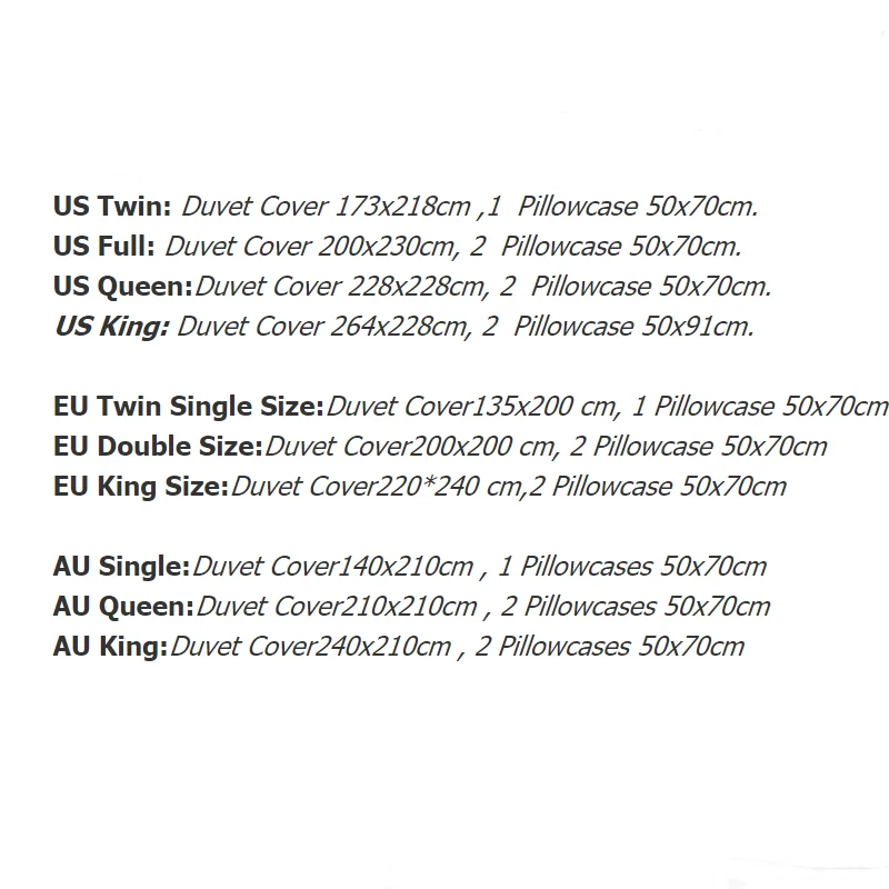 США Twin: пододеяльник 173x218 см, 1 Наволочка 50x70 см. США: пододеяльник 200x230 см, 2 наволочки 50x70 см. Королева США: пододеяльник 228x228 см, 2 наволочки 50x70 см. Американский Король: пододеяльник 264x228 см, 2 наволочки 50х91см. Европейский двойной размер: пододеяльник 135x200 см, 1 Наволочка 50x70см Европейский двойной размер: пододеяльник 200x200 см, 2 наволочки 50x70 см Европейский размер: пододеяльник 220*240 см, 2 наволочки 50х70см AU Single: пододеяльник 140х210см, 1 Наволочка 50х70см AU Queen: пододеяльник 210х210см, 2 наволочки 50х70см AU King: пододеяльник 240х210см, 2 наволочки 50х70см