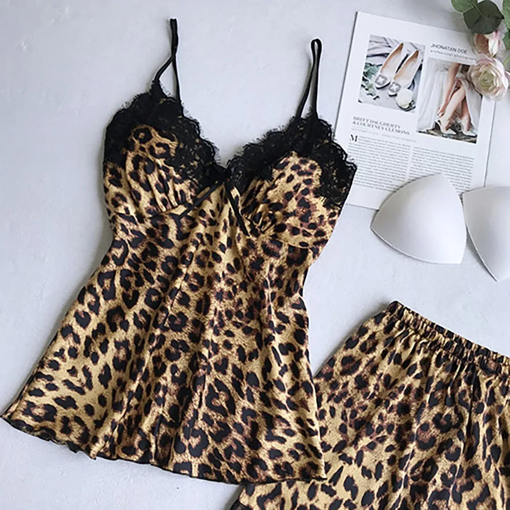 Женские пижамные комплекты с леопардовым принтом 2020, атласная одежда для сна, шелковая пижама из 4 предметов, кружевная Пижама для сна и отдыха с нагрудными подушечками