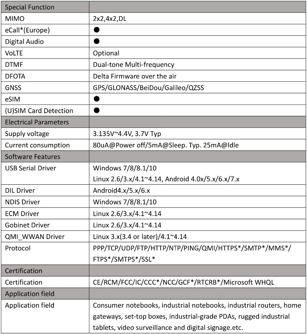 Богатый набор интернет-протоколов, стандартных интерфейсов отрасли и обильных функций (USB-драйверы для Windows 7, Win-dows 8/8.1. Windows 10, Linux, Android/eCall) расширяет применимость модуля к широкому спектру приложений M2M и IoT, таких как Промышленный маршрутизатор, домашний шлюз, STB, промышленный ноутбук, потребительский ноутбук, Промышленный PDA, прочный планшетный ПК, видеонаблюдение, цифровые вывески и т. д.