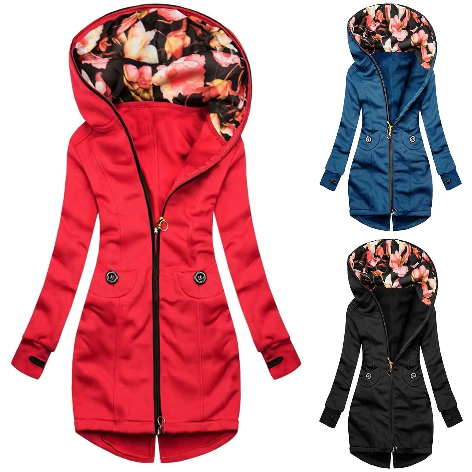 Женская модная куртка с цветочным принтом, толстовка на молнии с карманами, пальто с длинными рукавами