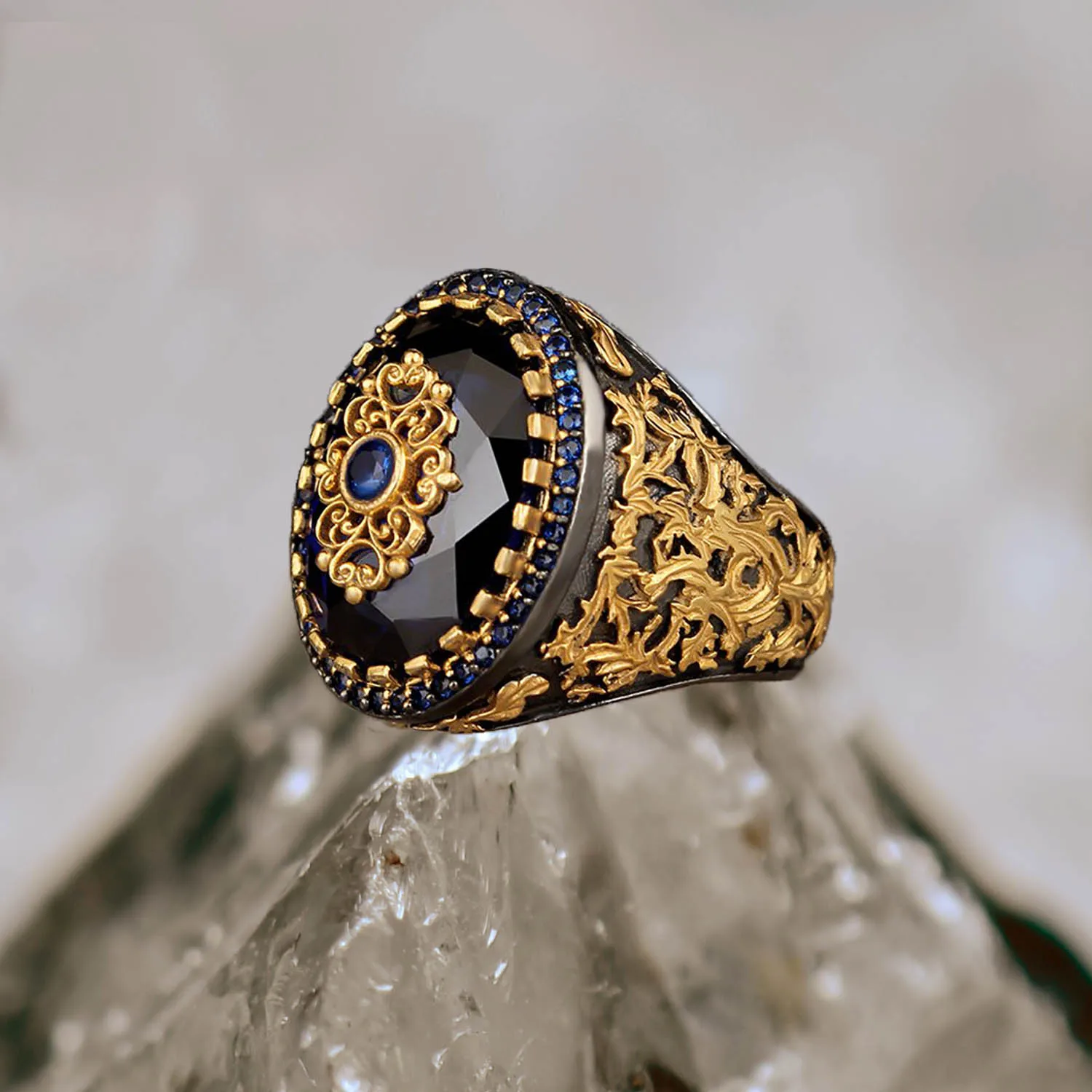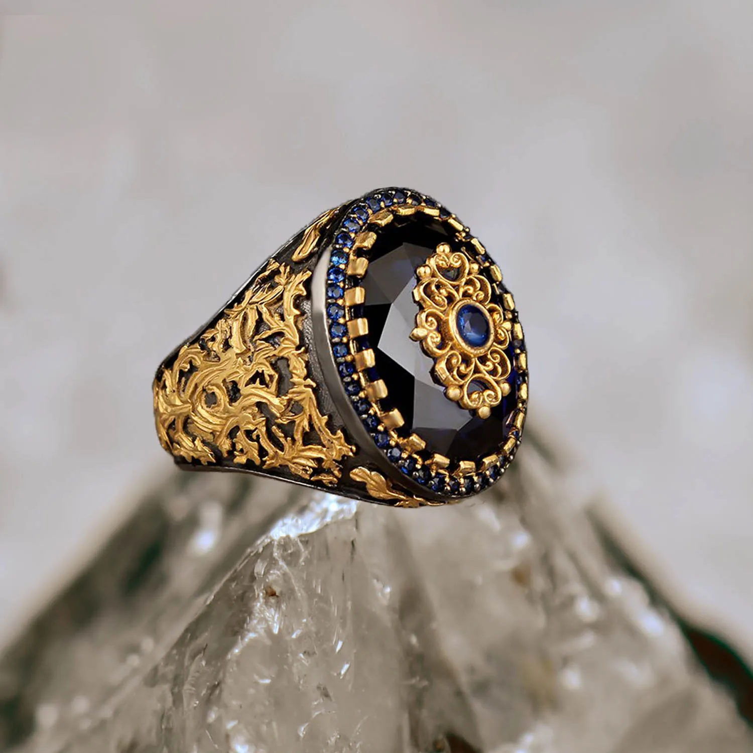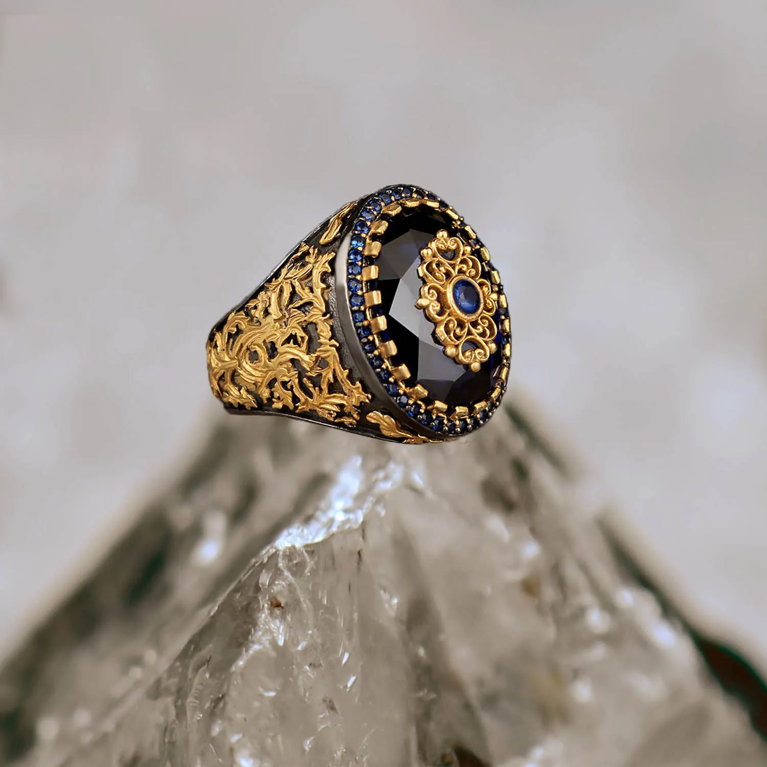 Мужское кольцо из циркониевого камня золотого цвета с родиевым покрытием 925 пробы серебряного цвета.