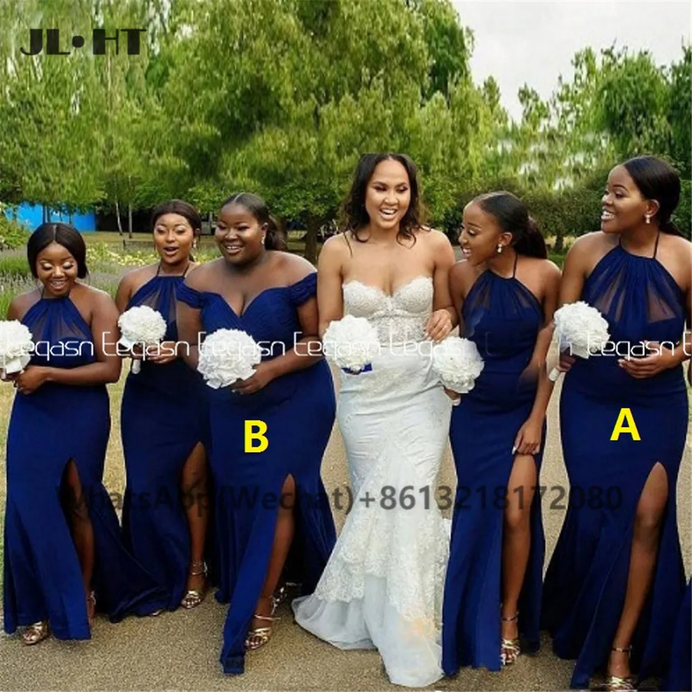 Африканское темно-синее черное женское платье подружки невесты, эластичное атласное платье с открытыми плечами для свадебной вечеринки, платье подружки невесты