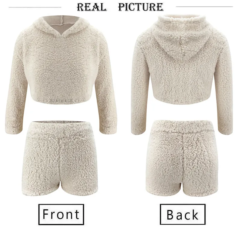 Пижамный комплект женский зимний из двух предметов, теплый мягкий худи с длинным рукавом, бархатная одежда для сна, однотонный меховой цвет, топ и шорты, 2020