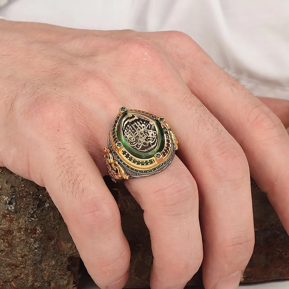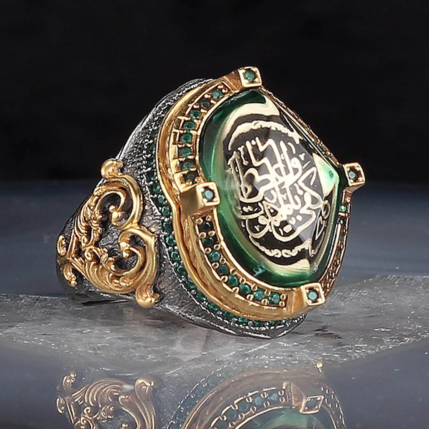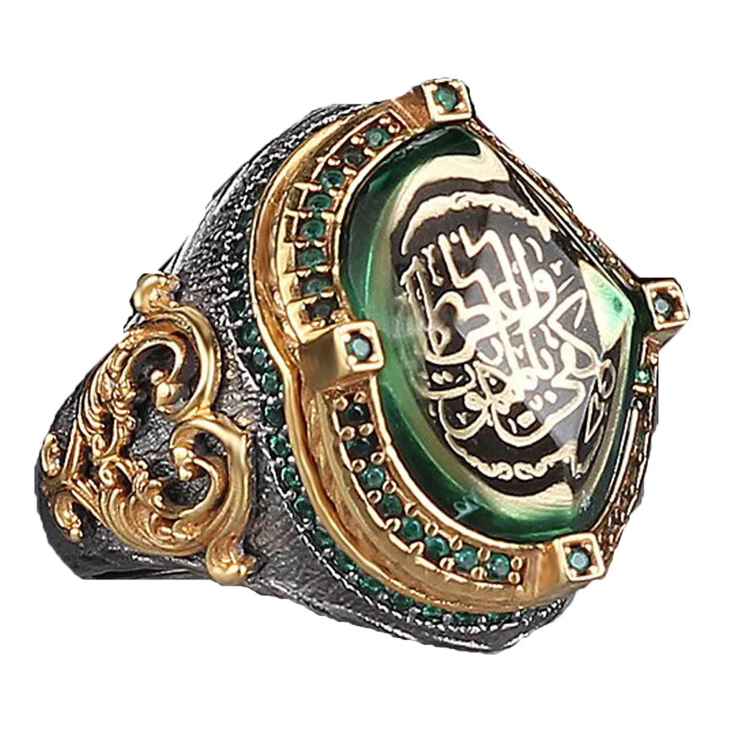 Зеленый янтарный камень «Death достаточно в качестве советника», написанный арабскими буквами, золотой цвет, разработанный родиевым покрытием, 925 пробы Серебряное мужское кольцо.