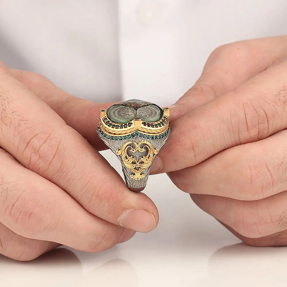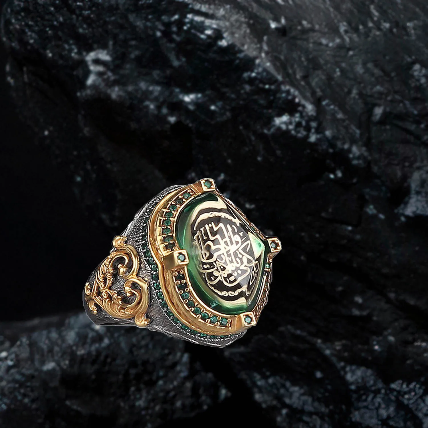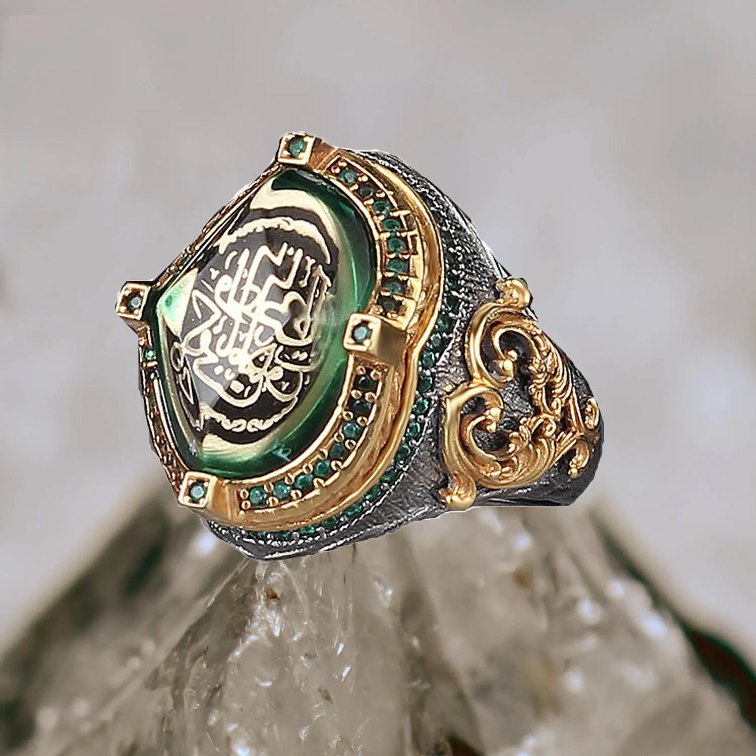 Зеленый янтарный камень «Death достаточно в качестве советника», написанный арабскими буквами, золотой цвет, разработанный родиевым покрытием, 925 пробы Серебряное мужское кольцо.