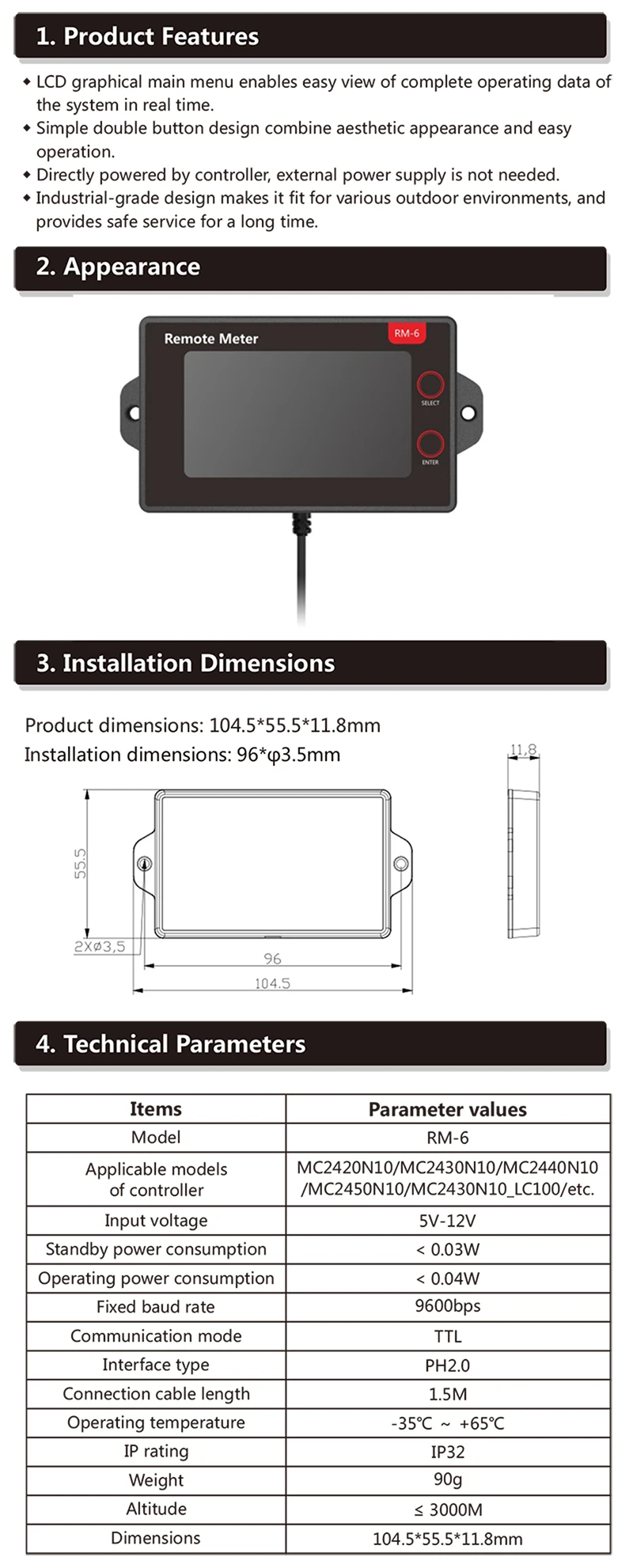 Пульт дистанционного управления RM-6, ЖК-дисплей для контроллера солнечной батареи SRNE MC серии MPPT, мониторинг данных и рабочего состояния в реальном времени