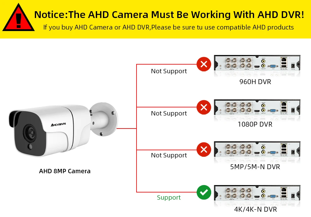 1.HD 4K AHD камера работает только с 5MP AHD DVR или 4K-N AHD DVR или 4K AHD DVR,! Пожалуйста, убедитесь, что ваш AHD DVR поддерживает 4K HD камеру перед покупкой!
