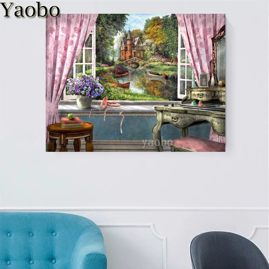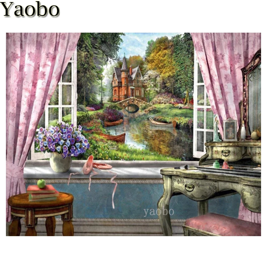 Алмазная 5D картина сделай сам, Набор для вышивки квадратными стразами Замок, с окошком, украшение для сада