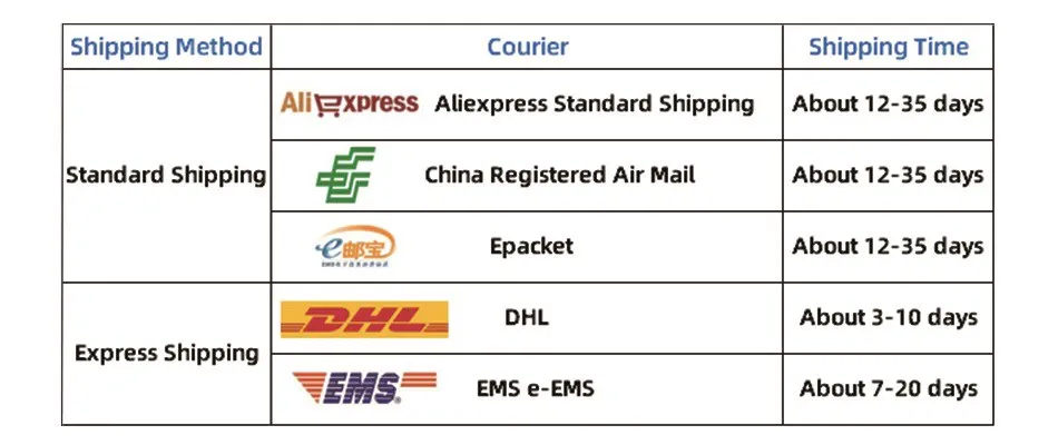 1) Мы принимаем Почта Китая, EMS,DHL и Epacket (для США и России).2) Время доставки:A. DHL обычно занимает 5-8 рабочих дней (не включая праздники и выходные).B. EMS обычно занимает 5-8 рабочих дней (не включая праздники и выходные).C. Epacket обычно занимает 5-15 рабочих дней (не включая праздники и выходные).D. Авиа-отправление Почты Китая: