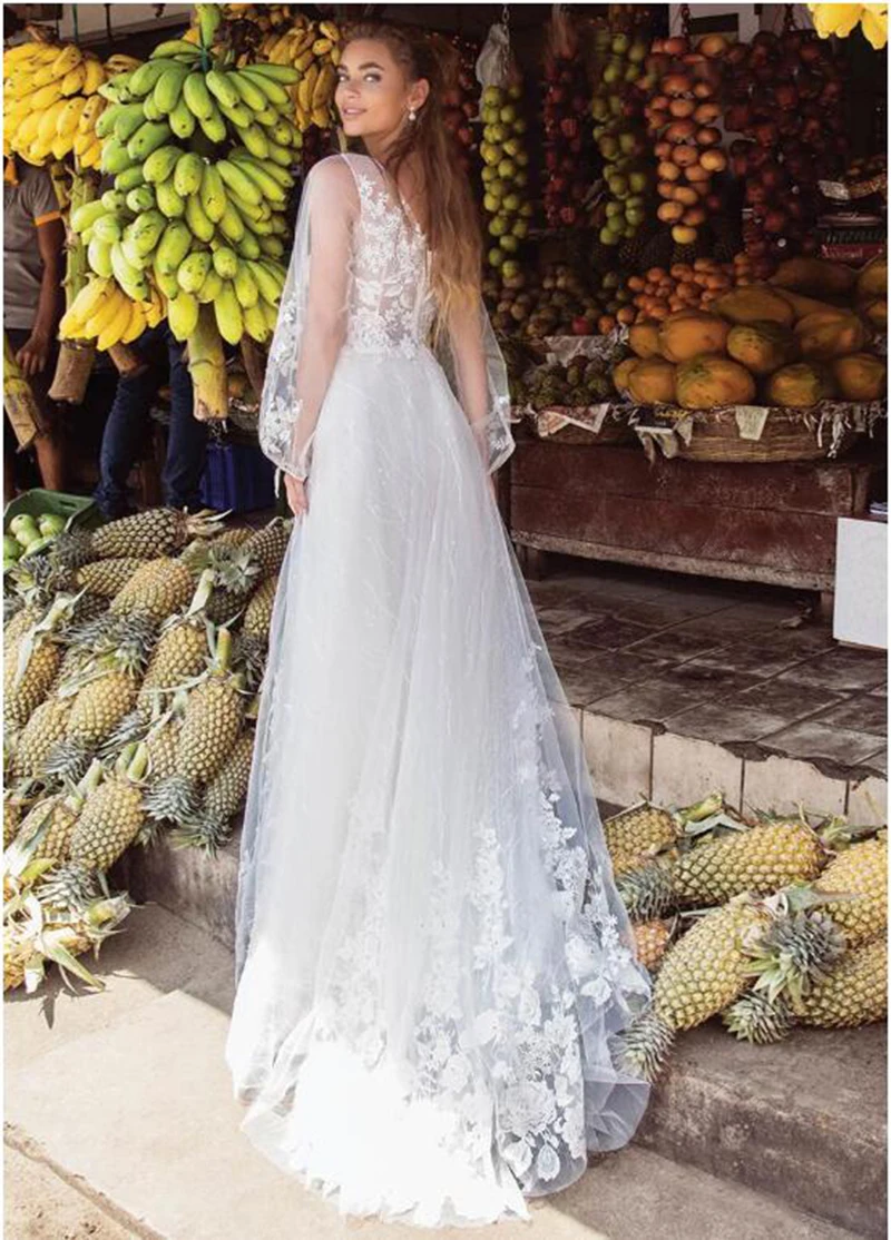 Кружевное свадебное платье в стиле бохо 2021, Прозрачный лиф с V-образным вырезом, трапециевидная аппликация, Пляжное блестящее свадебное платье с длинными рукавами, свадебные платья